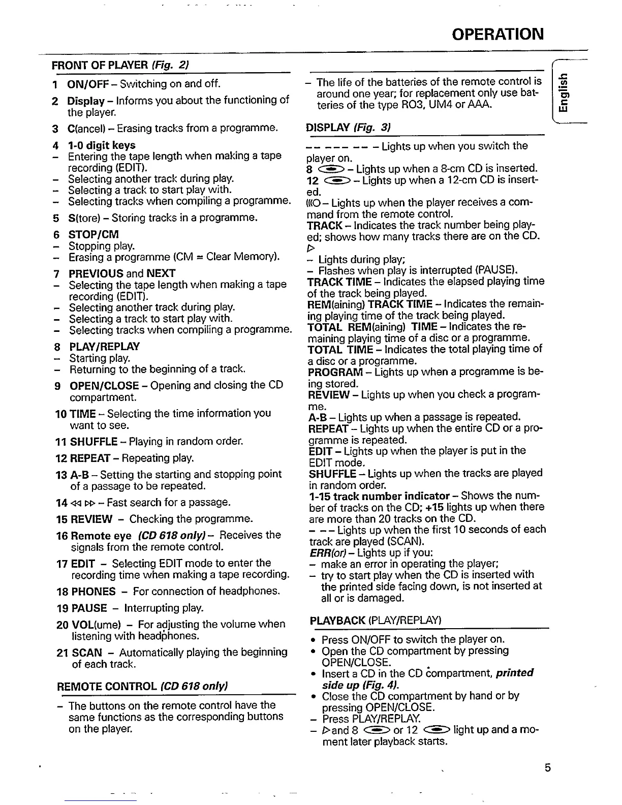 Philips CD 618 - Operating the CD Player; Front Panel Controls (Fig. 2); Display Indicators (Fig. 3); Remote Control Functions