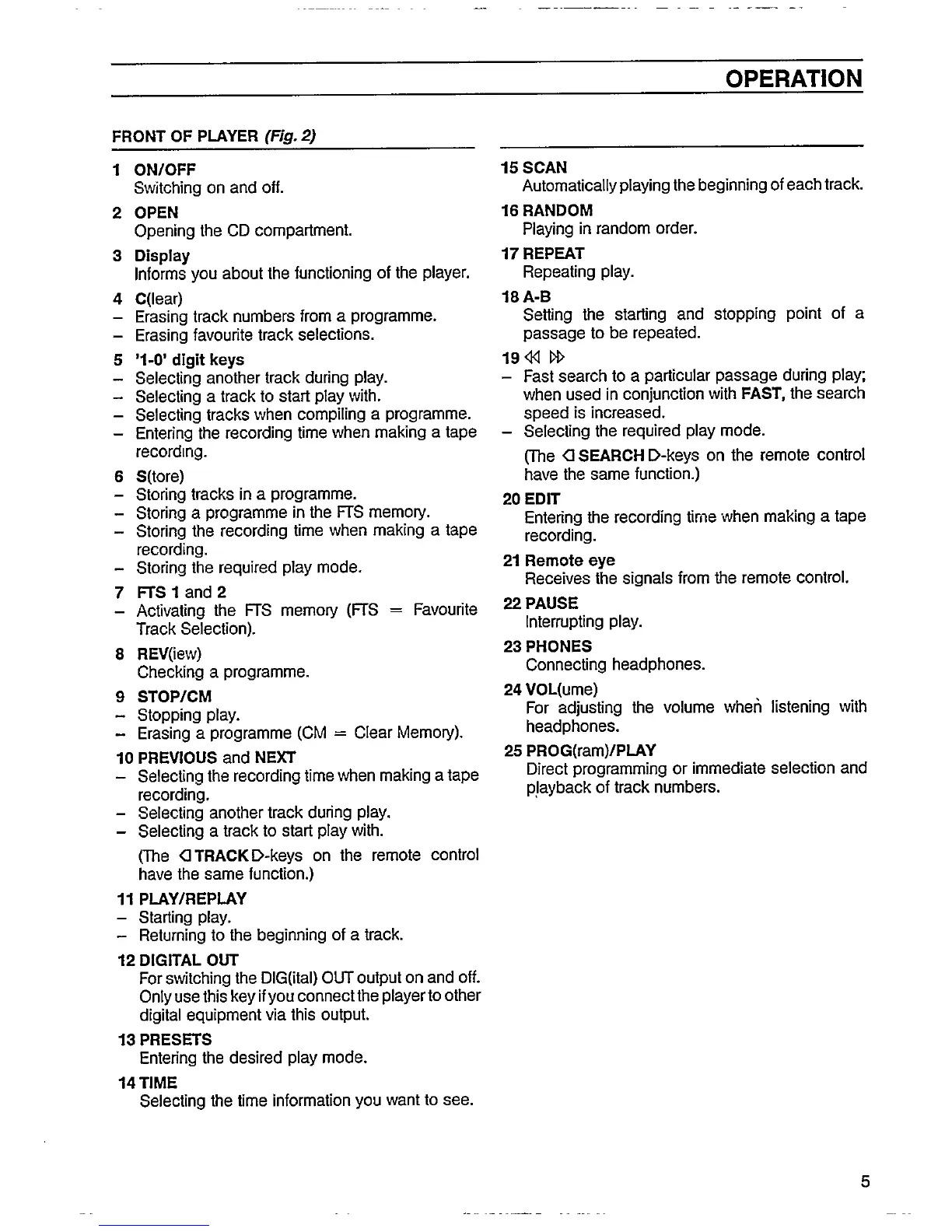 Philips CD 624 - OPERATION; FRONT OF PLAYER; DISPLAY INDICATORS; PLAYBACK CONTROL