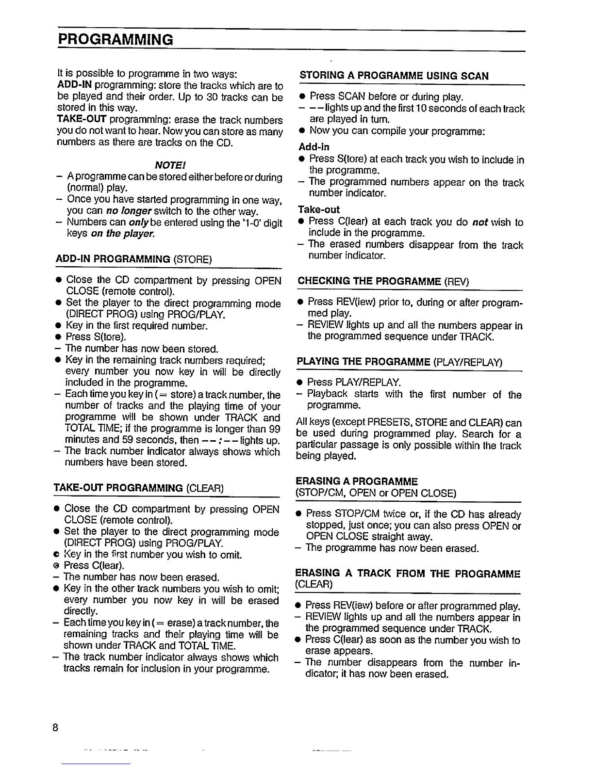 Philips CD 624 - PROGRAMMING; ADD-IN PROGRAMMING; TAKE-OUT PROGRAMMING; STORING A PROGRAMME USING SCAN