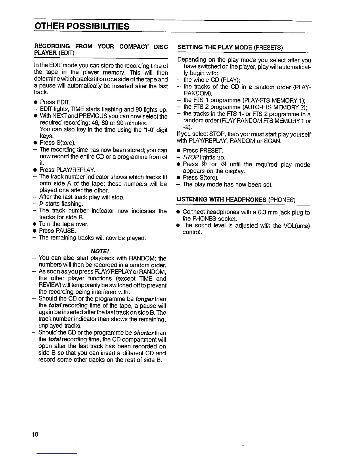 Philips CD 624 - OTHER POSSIBILITIES; RECORDING FROM COMPACT DISC PLAYER (EDIT); SETTING THE PLAY MODE (PRESETS); LISTENING WITH HEADPHONES