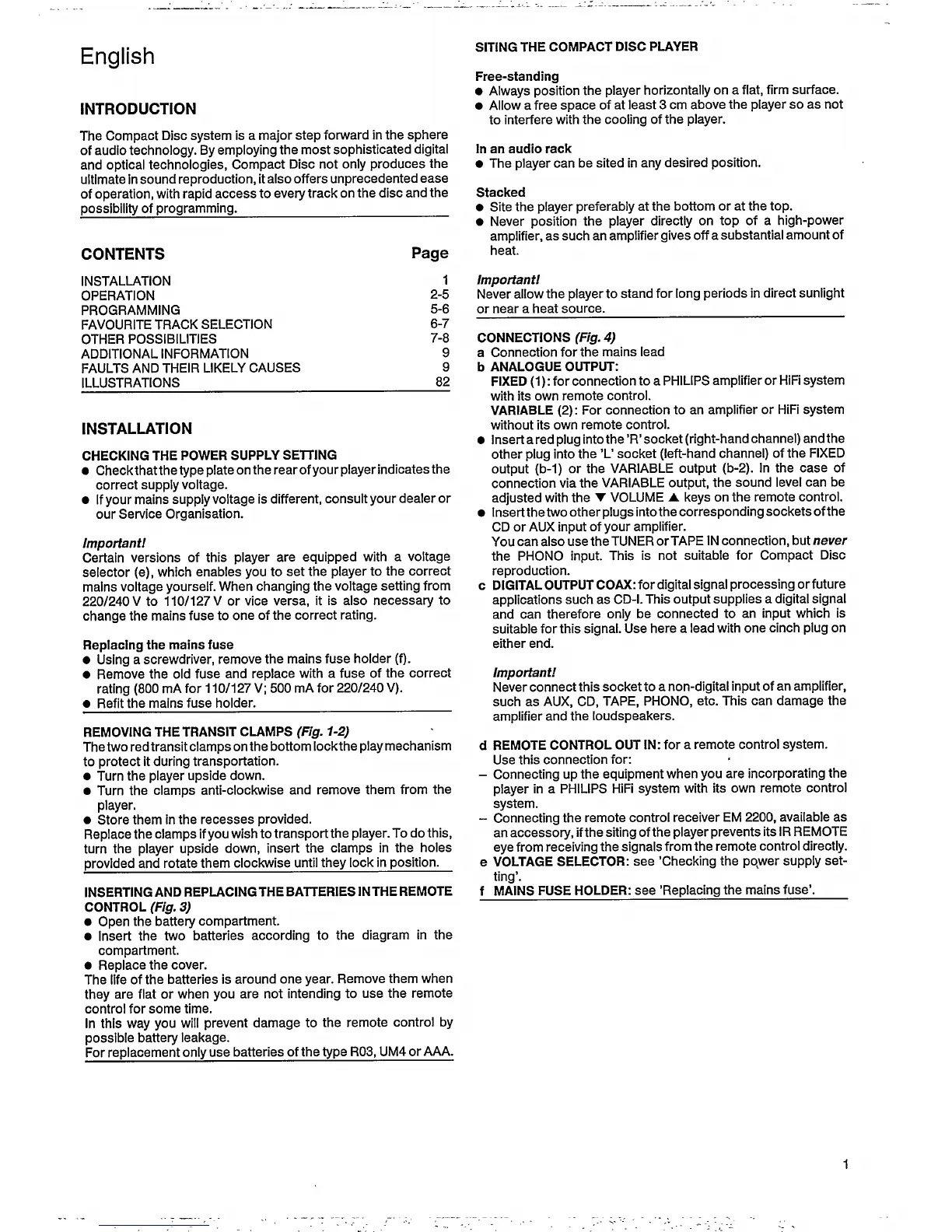 Philips CD 630 - INSTALLATION AND SETUP; Power Supply and Fuse Check; Siting and Connections