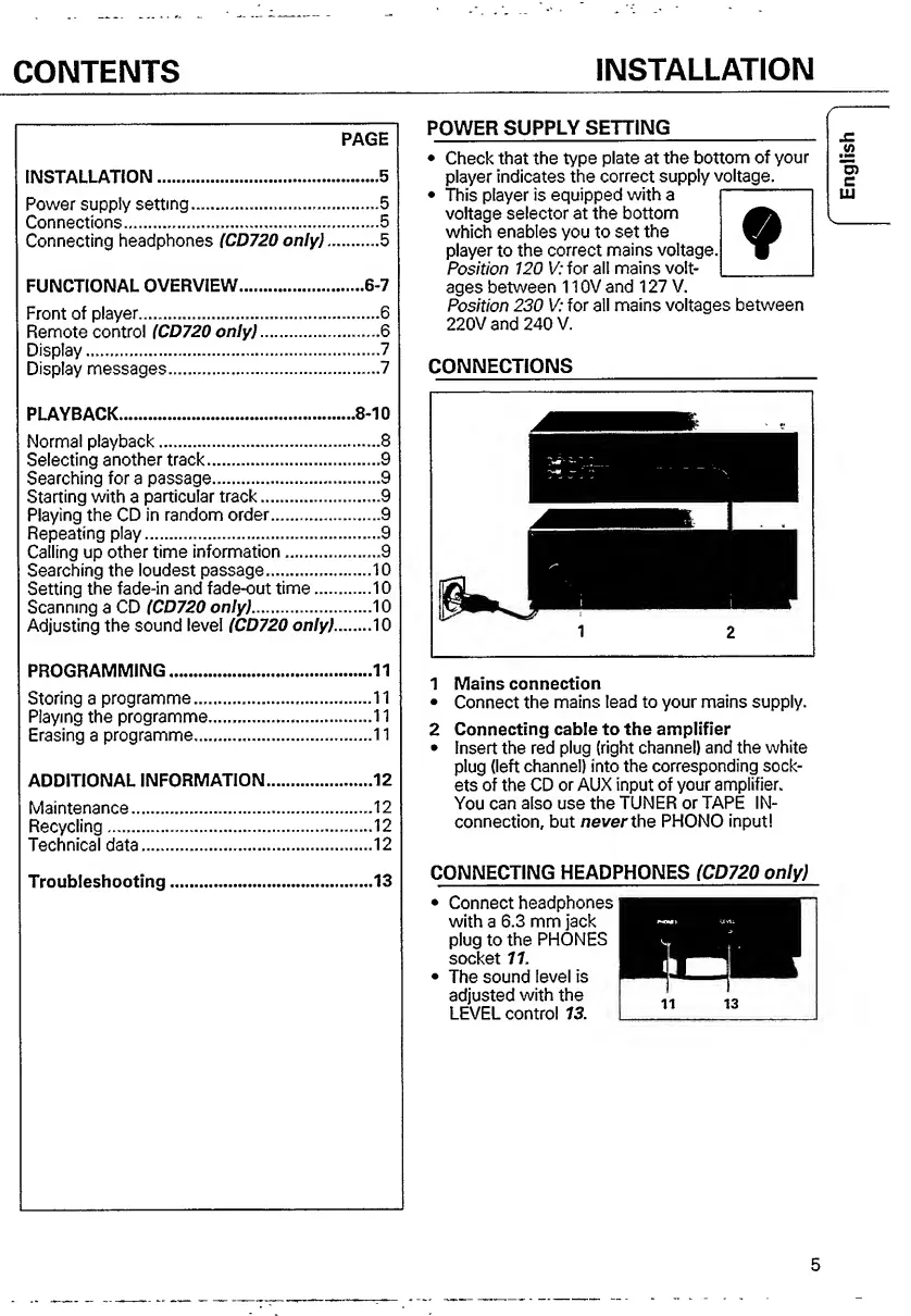 Philips CD 710 - Table of Contents; Power Supply Setting; Connections; Connecting Headphones (CD720 Only)