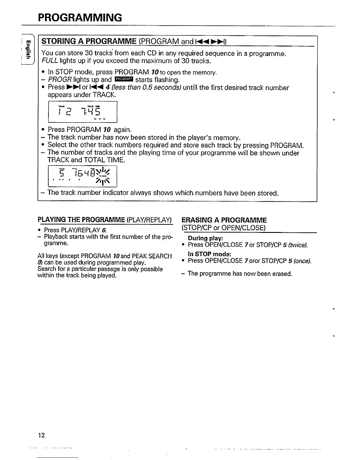 Philips CD 722 - PROGRAMMING; STORING A PROGRAMME (PROGRAM and < >>); PLAYING THE PROGRAMME (PLAY;REPLAY); ERASING A PROGRAMME (STOP;CP or OPEN;CLOSE)