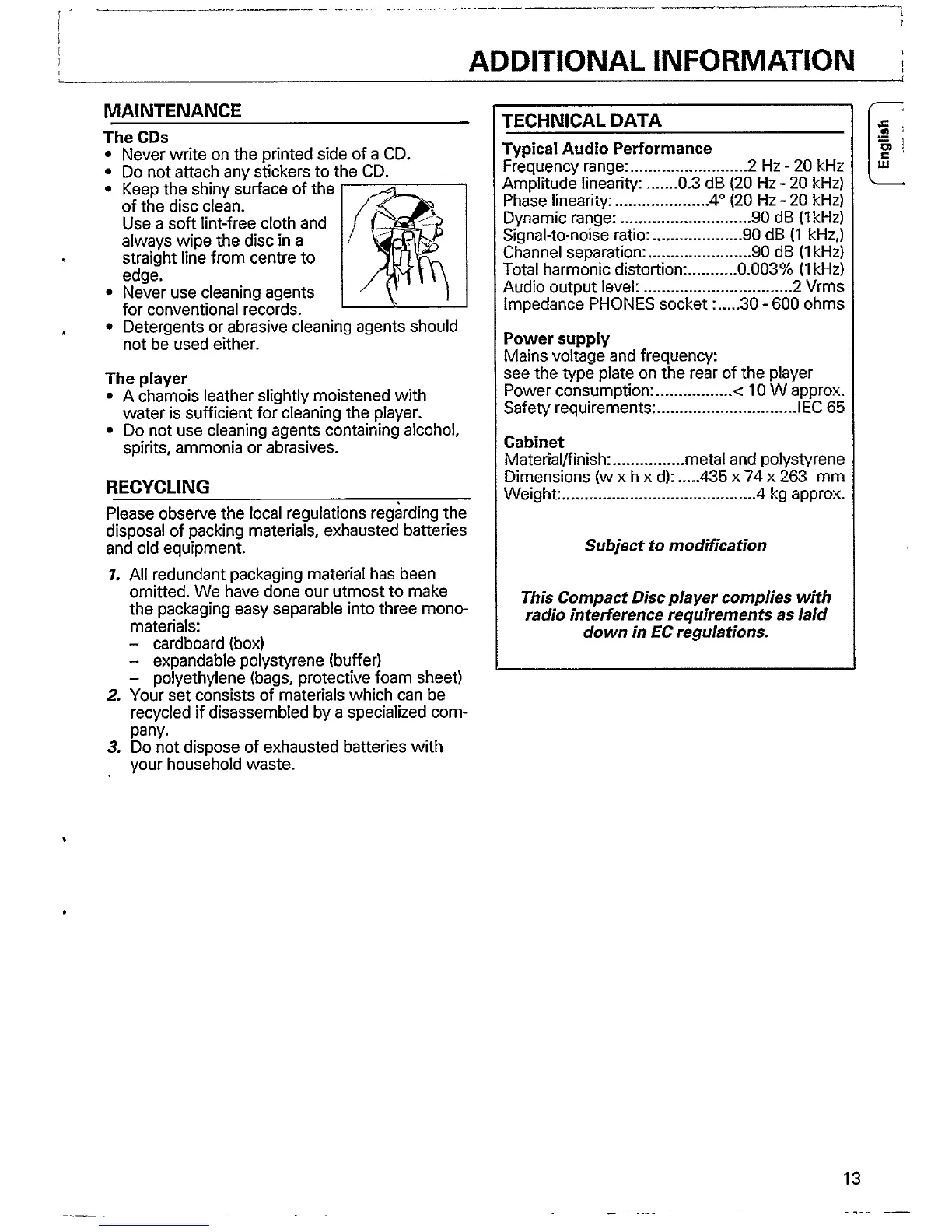Philips CD 722 - Maintenance; Recycling; Technical Data