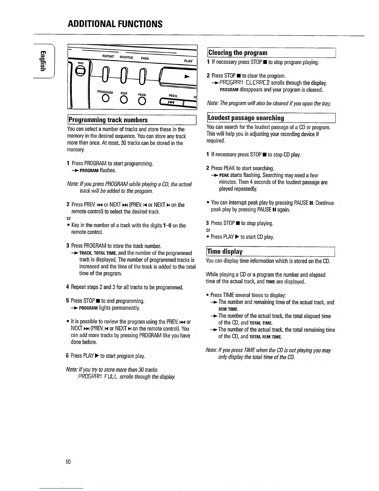 Philips CD 723 - Additional Functions; Programming Track Numbers; Clearing the Program; Loudest Passage Searching