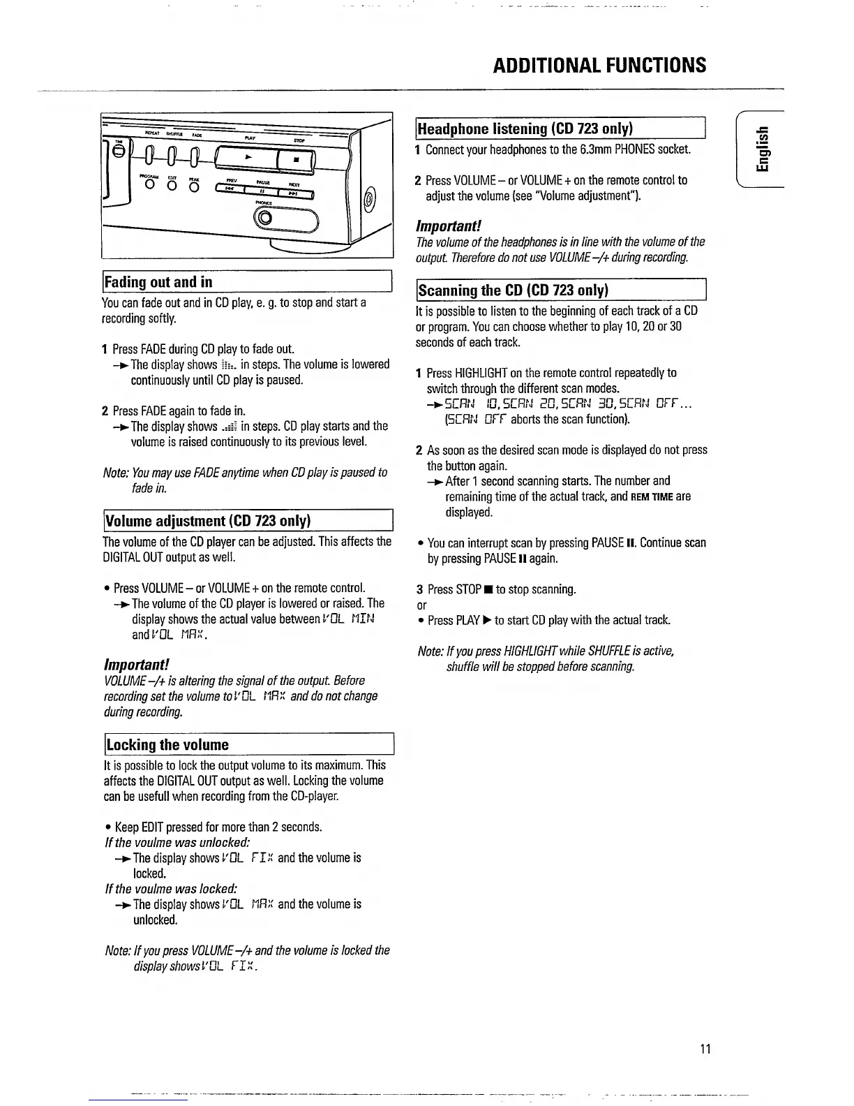 Philips CD 723 - Additional Functions (Continued); Headphone Listening (CD 723 only); Scanning the CD (CD 723 only); Fading Out and In