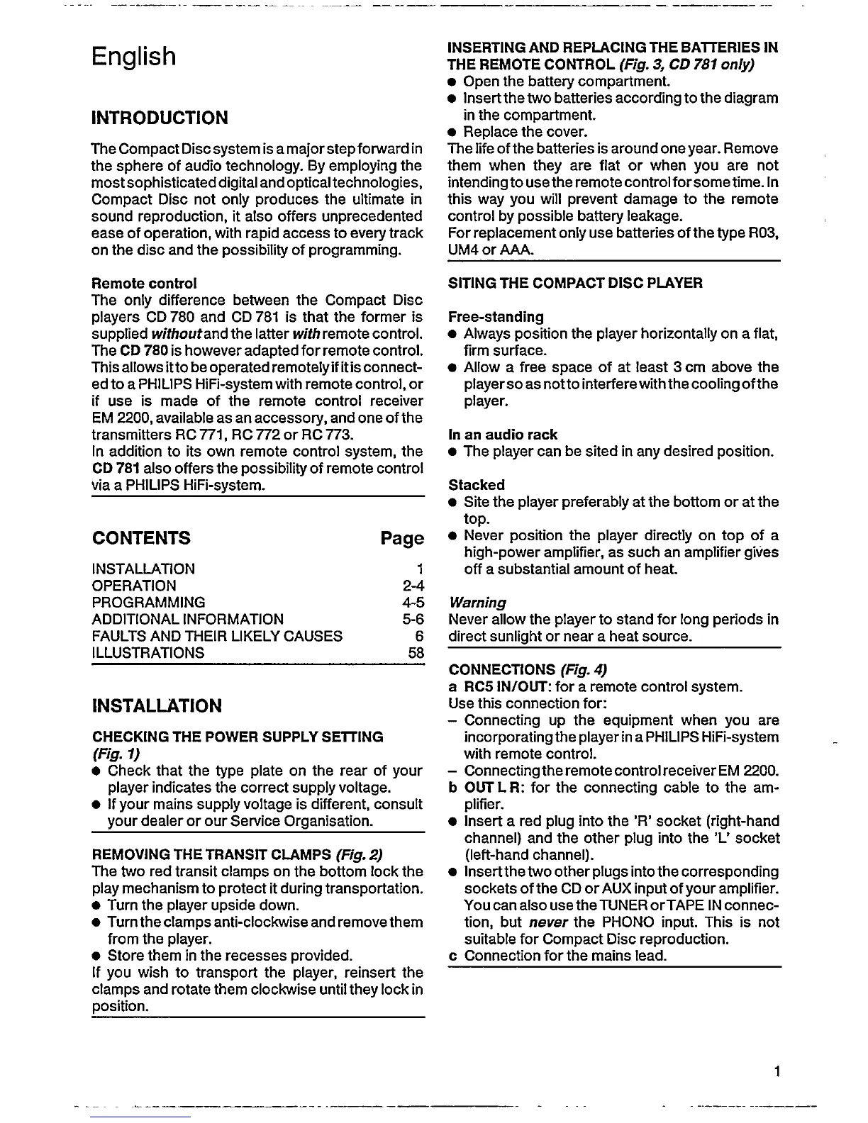 Philips CD 780 - Introduction to the Compact Disc Player; Remote Control Functionality; Installation and Setup; Power Supply and Transit Clamp Checks