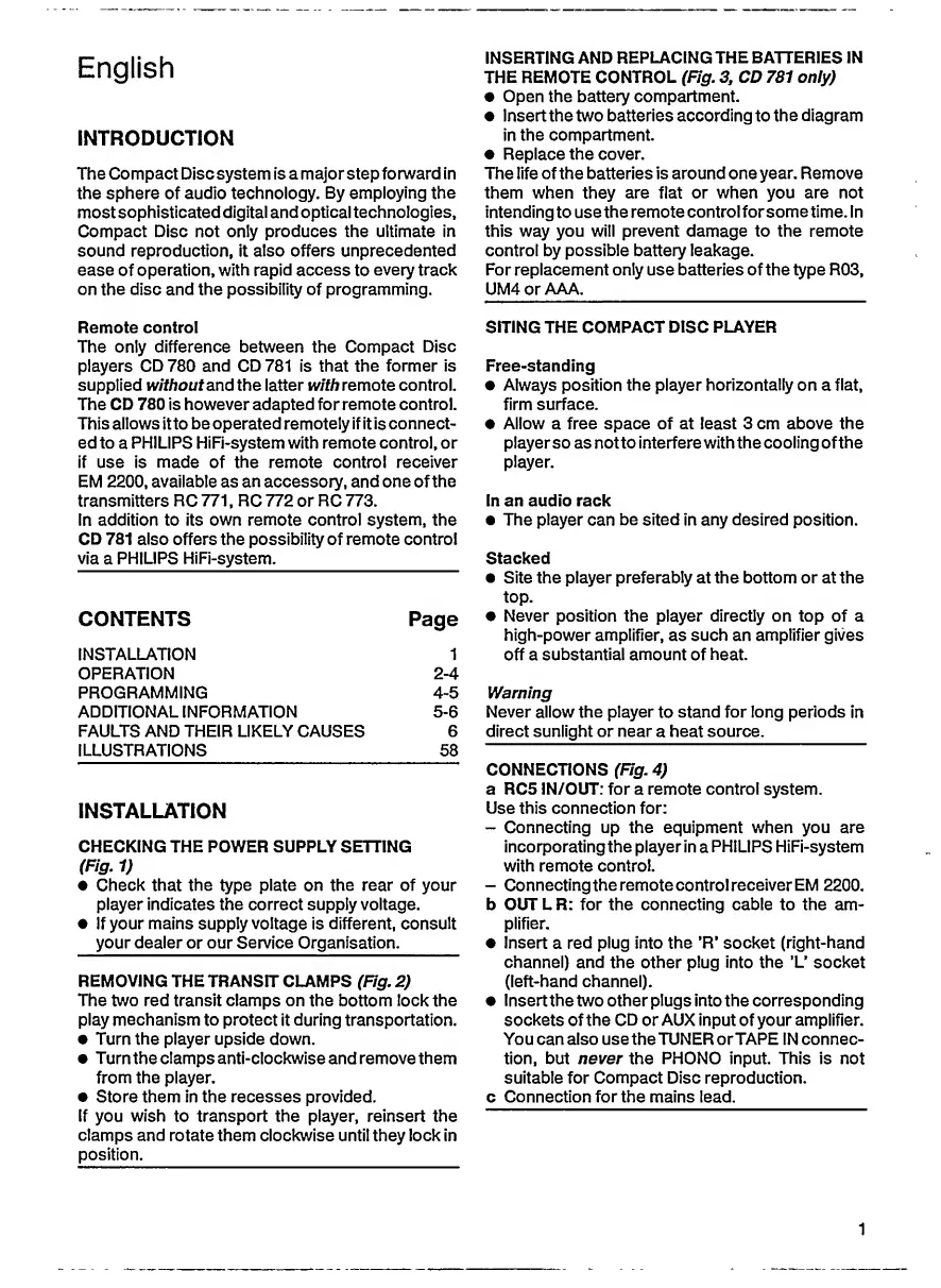 Philips CD 780 - Introduction to the Compact Disc Player; Remote Control Functionality; Installation and Setup; Power Supply and Transit Clamp Checks
