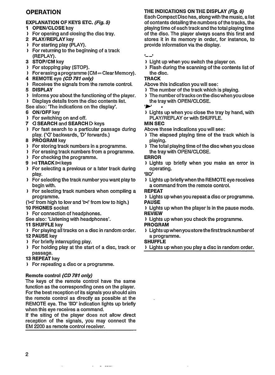 Philips CD 780 - Operation Overview; Control Panel and Key Functions; Display Indicators Explained; Remote Control Operation (CD 781)