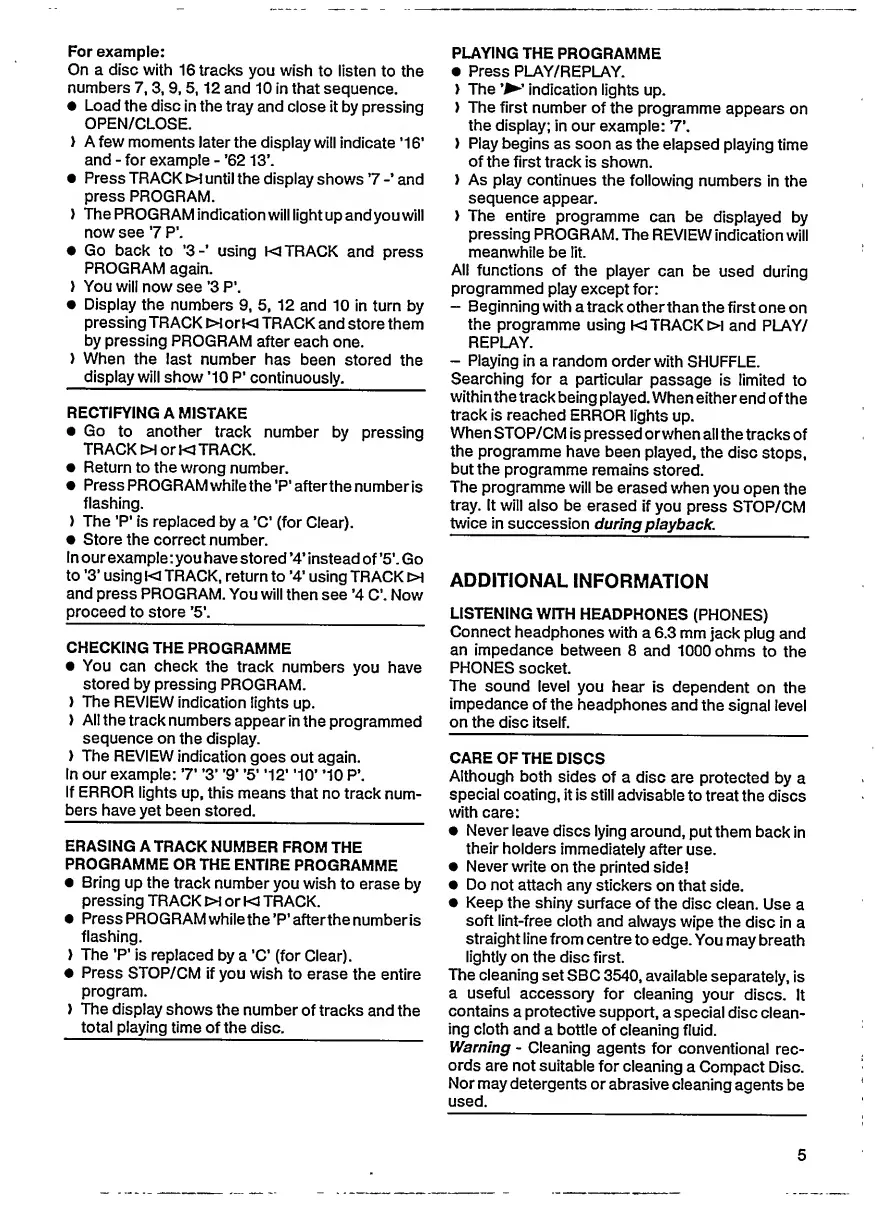 Philips CD 780 - Programme Management and User Information; Managing Programmed Sequences; Headphones and Disc Care