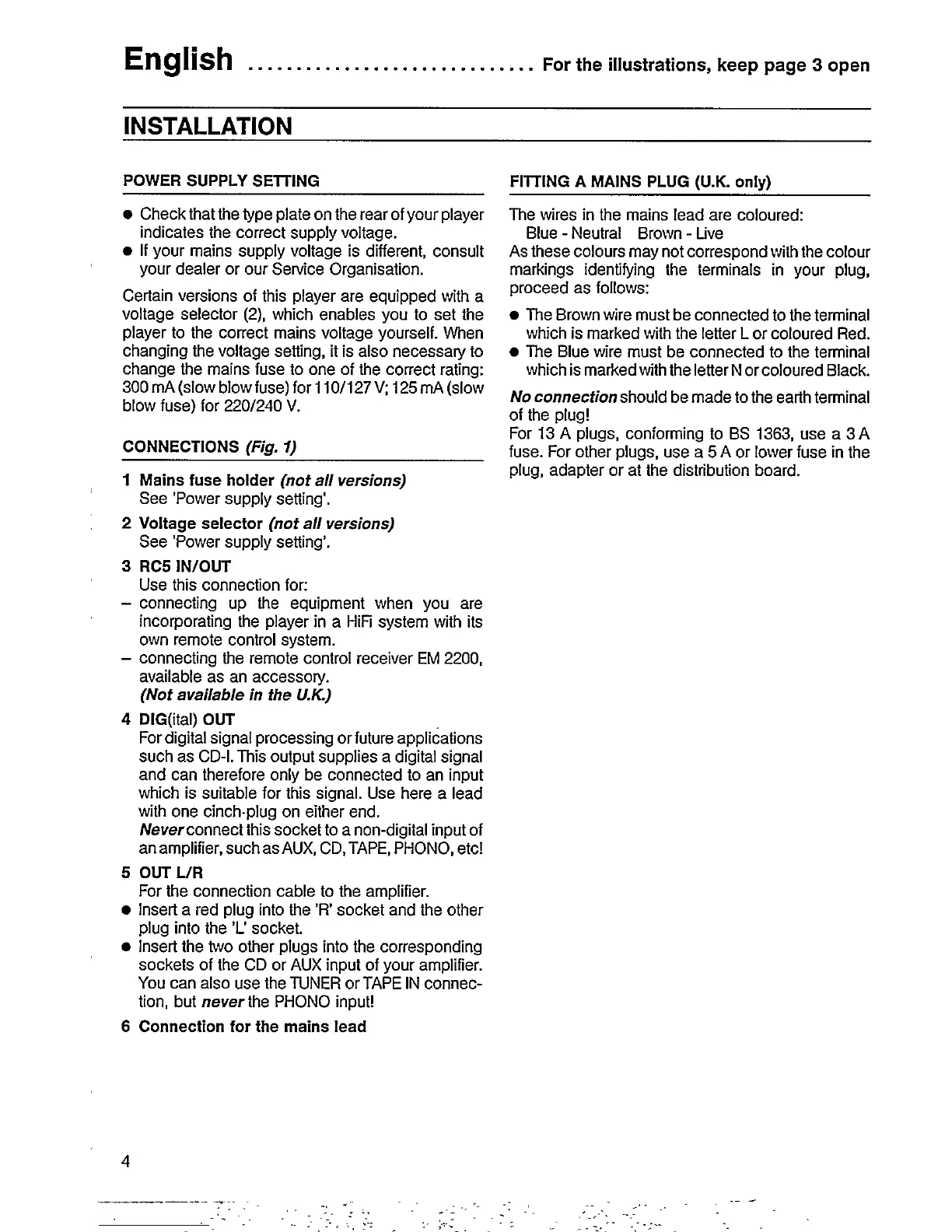 Philips CD 824 - Installation and Setup; Power Supply Settings; Connection Ports; UK Mains Plug Fitting