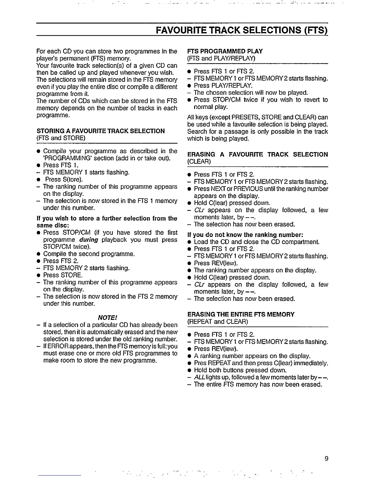 Philips CD 824 - Favourite Track Selections (FTS); Storing Favourite Track Selections; Playing Favourite Track Selections; Erasing Favourite Track Selections