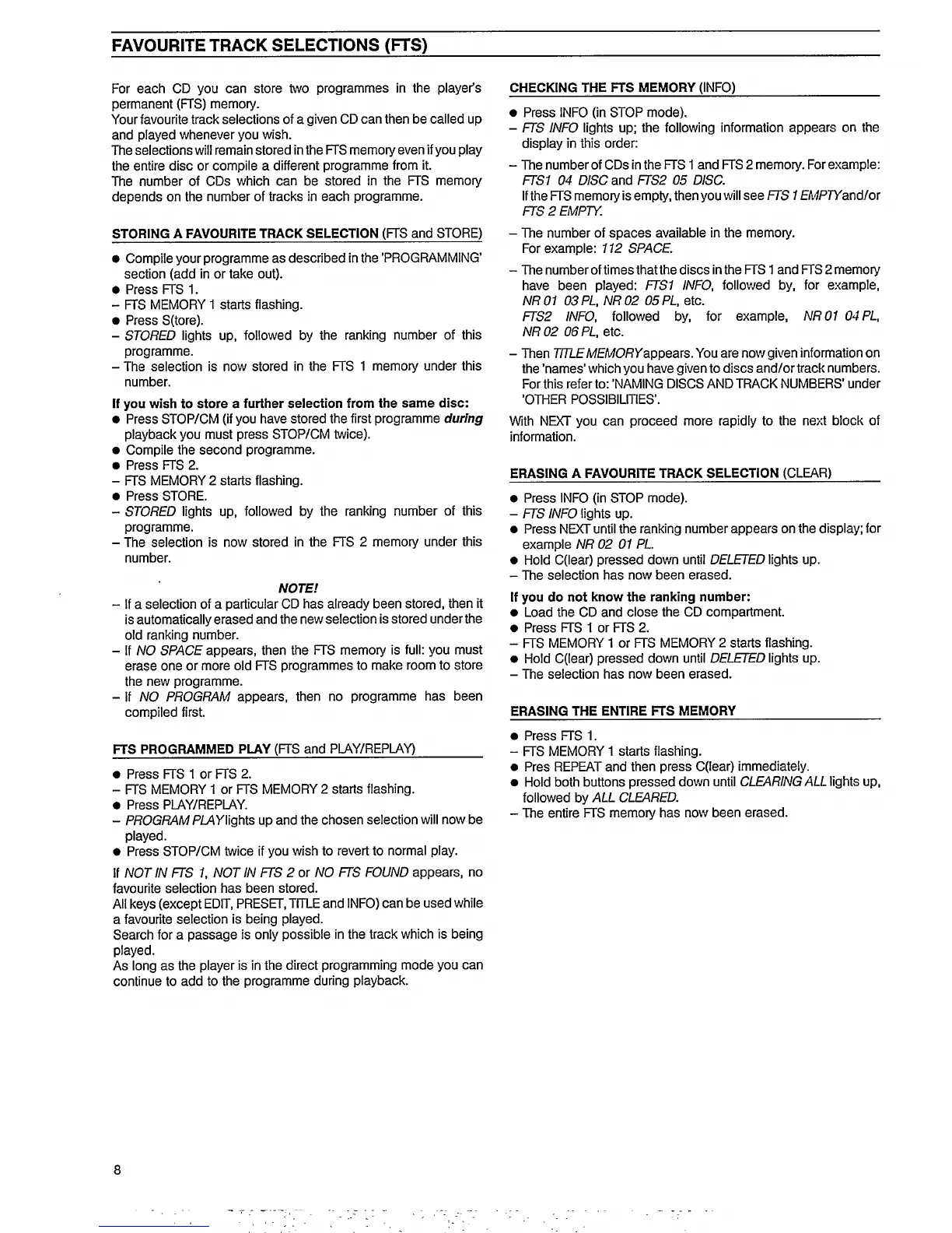 Philips CD 850 - Favourite Track Selection (FTS); Storing Favourite Tracks; Playing and Checking FTS; Erasing FTS Selections