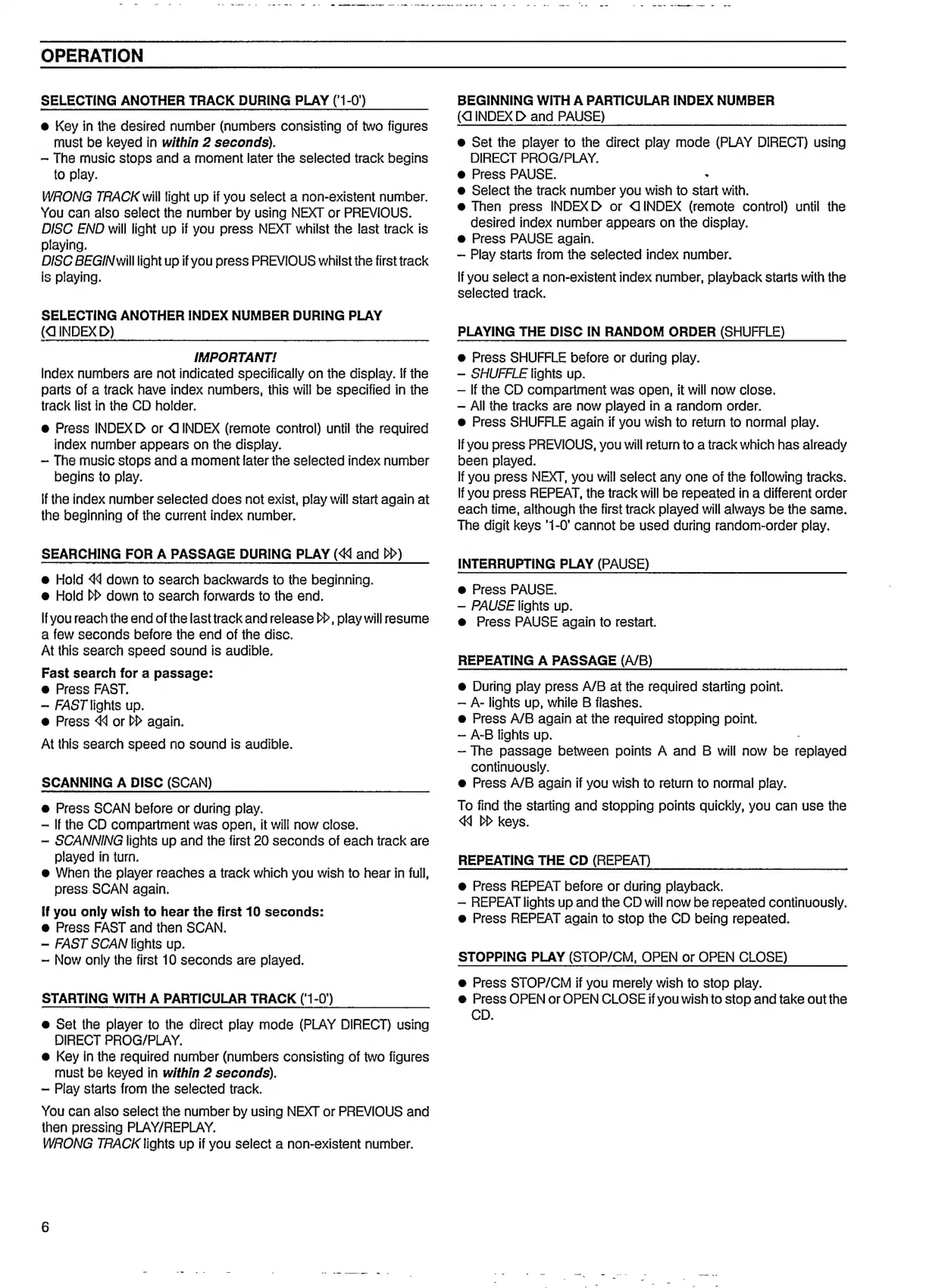 Philips CD 850 - Player Operation and Controls; Selecting Tracks and Indexes; Searching and Scanning Functions; Playback Modes