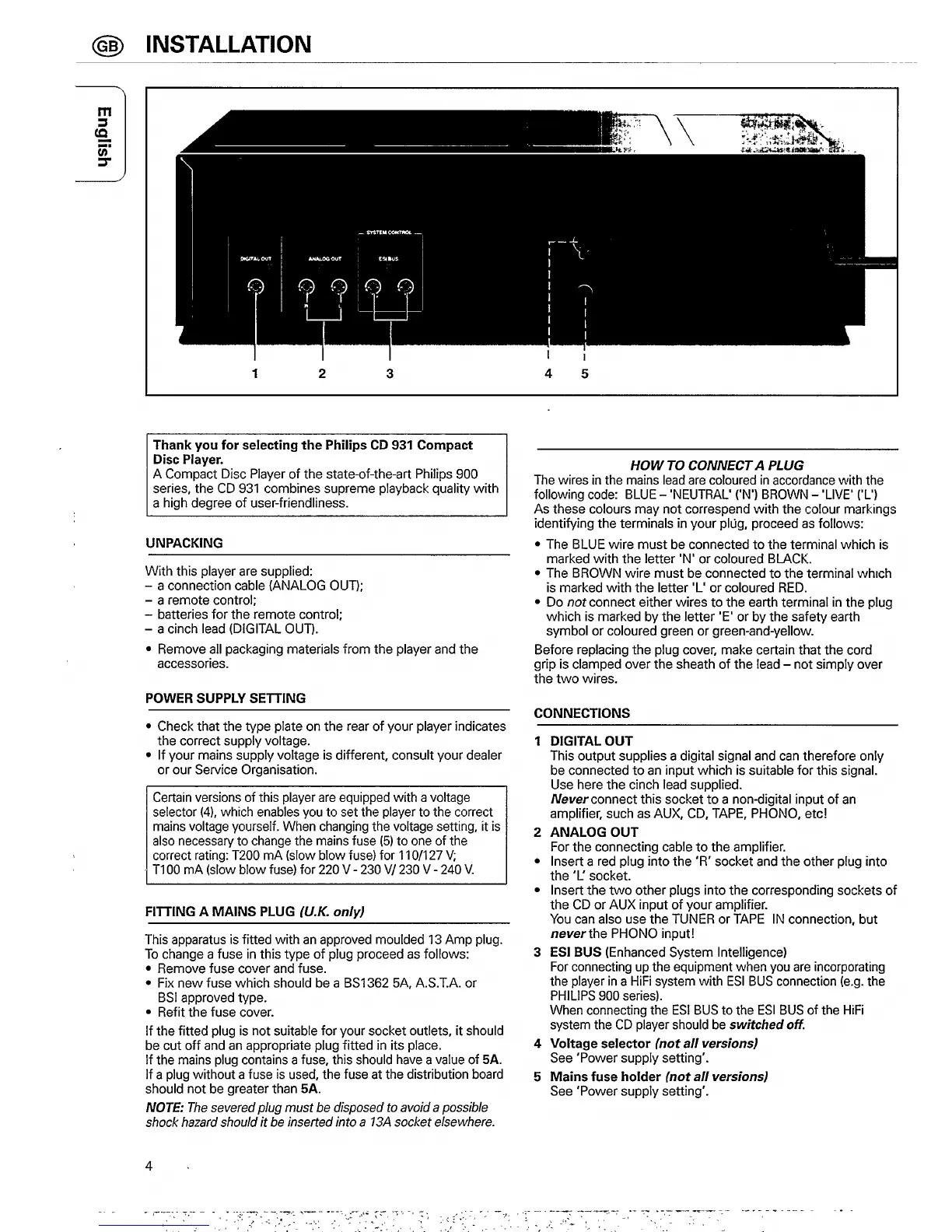 Philips CD 931 - Installation Guide; Product Introduction and Unpacking; Power Supply and Plug Connection; Connecting the Player to Audio Systems