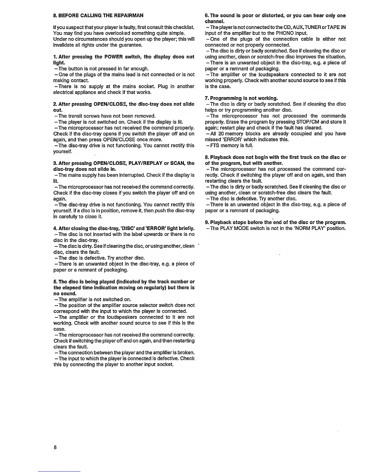 Philips CD 960 - 8. BEFORE CALLING THE REPAIRMAN; Display and Disc Tray Issues; Audio and Playback Faults; Programming and Playback Faults