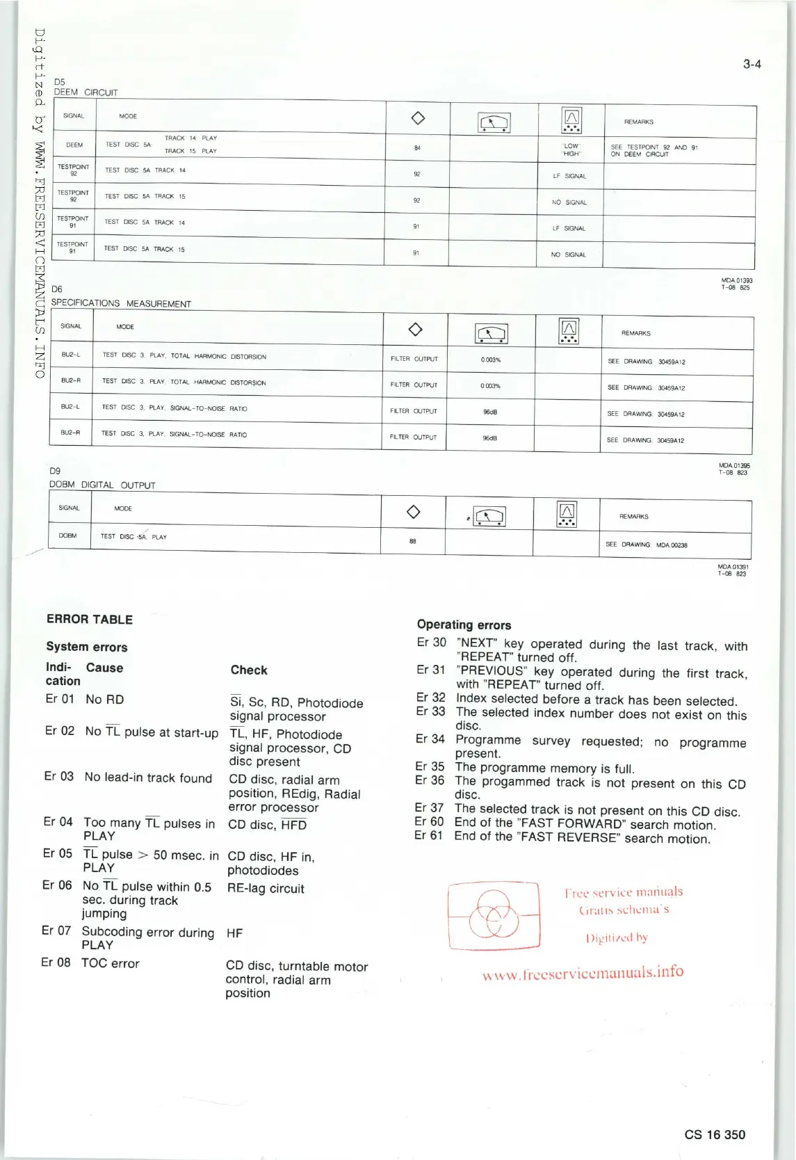 Philips cd380 - Decoding Circuit Tests; DEEM Circuit and DOBM Output Tests; Specifications Measurement; Error and Operating Error Table
