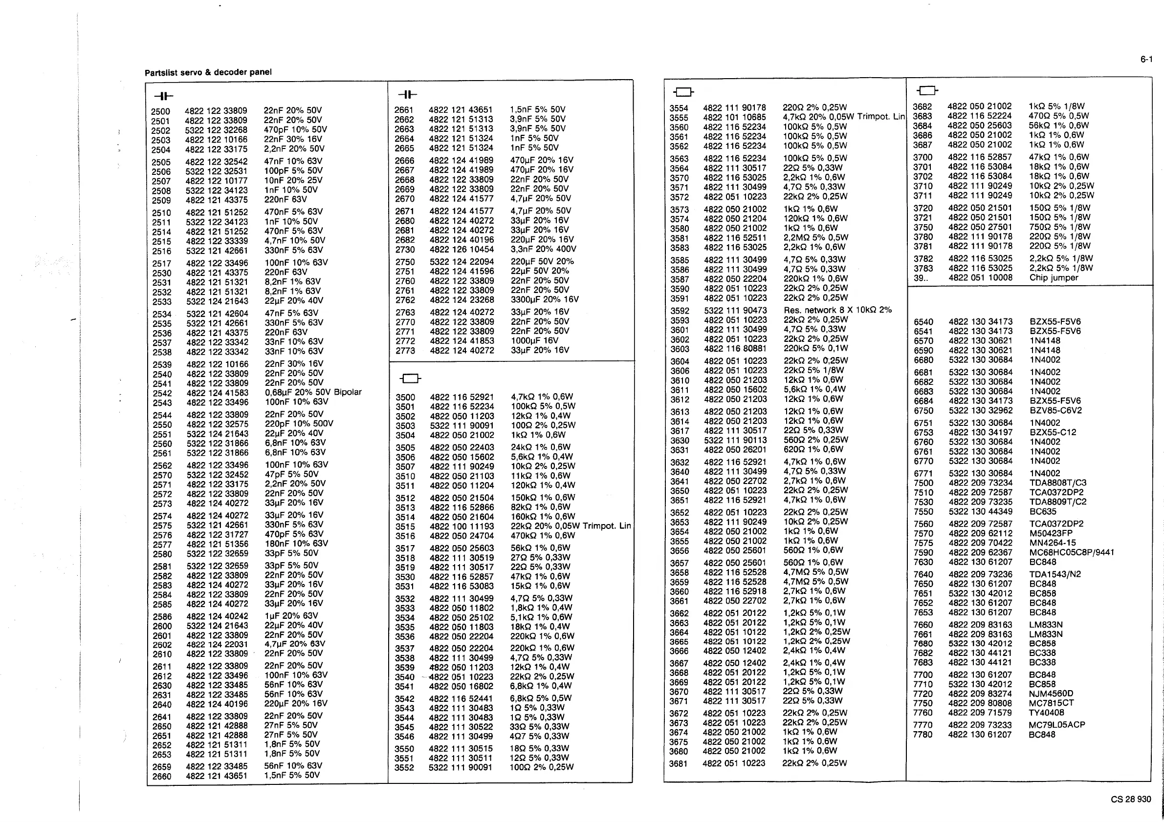 Philips CD604 - Parts Lists; Servo & Decoder Panel Partslist; Main Panel Partslist