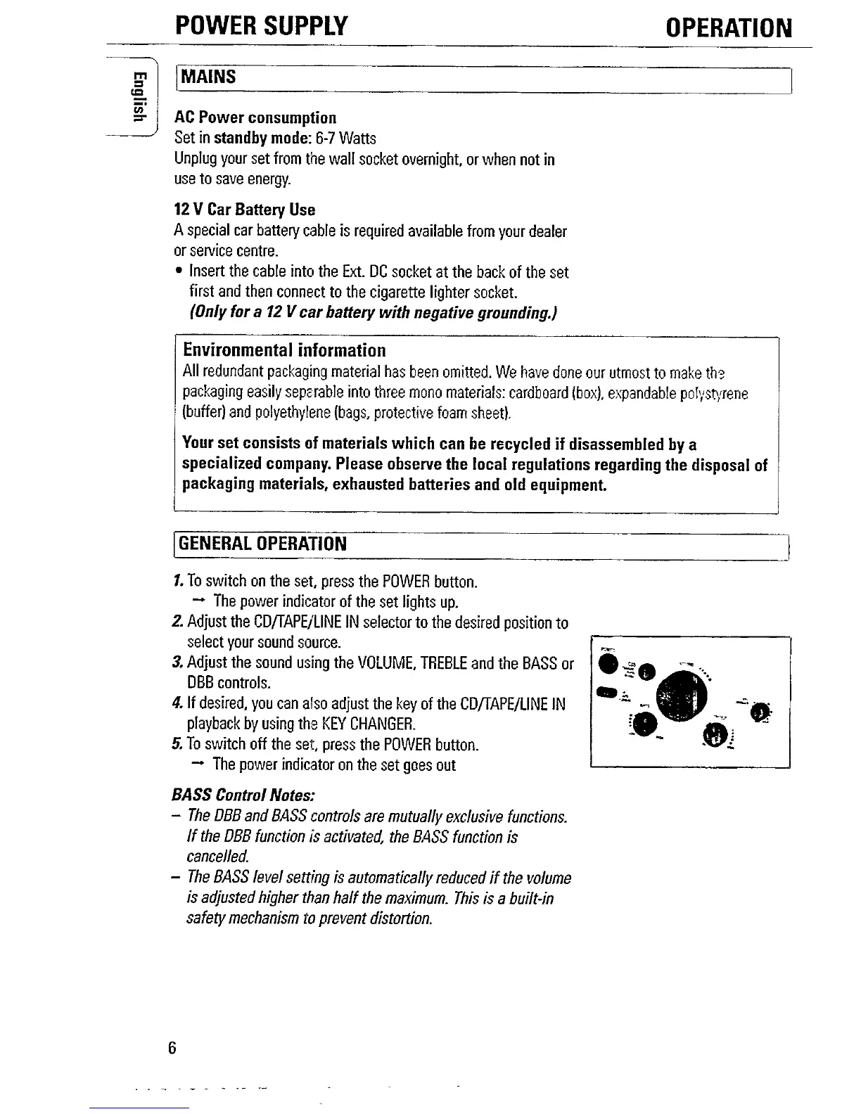 Philips CD6660/00 - Operation; AC Power Consumption; 12 V Car Battery Use; Bass Control Notes
