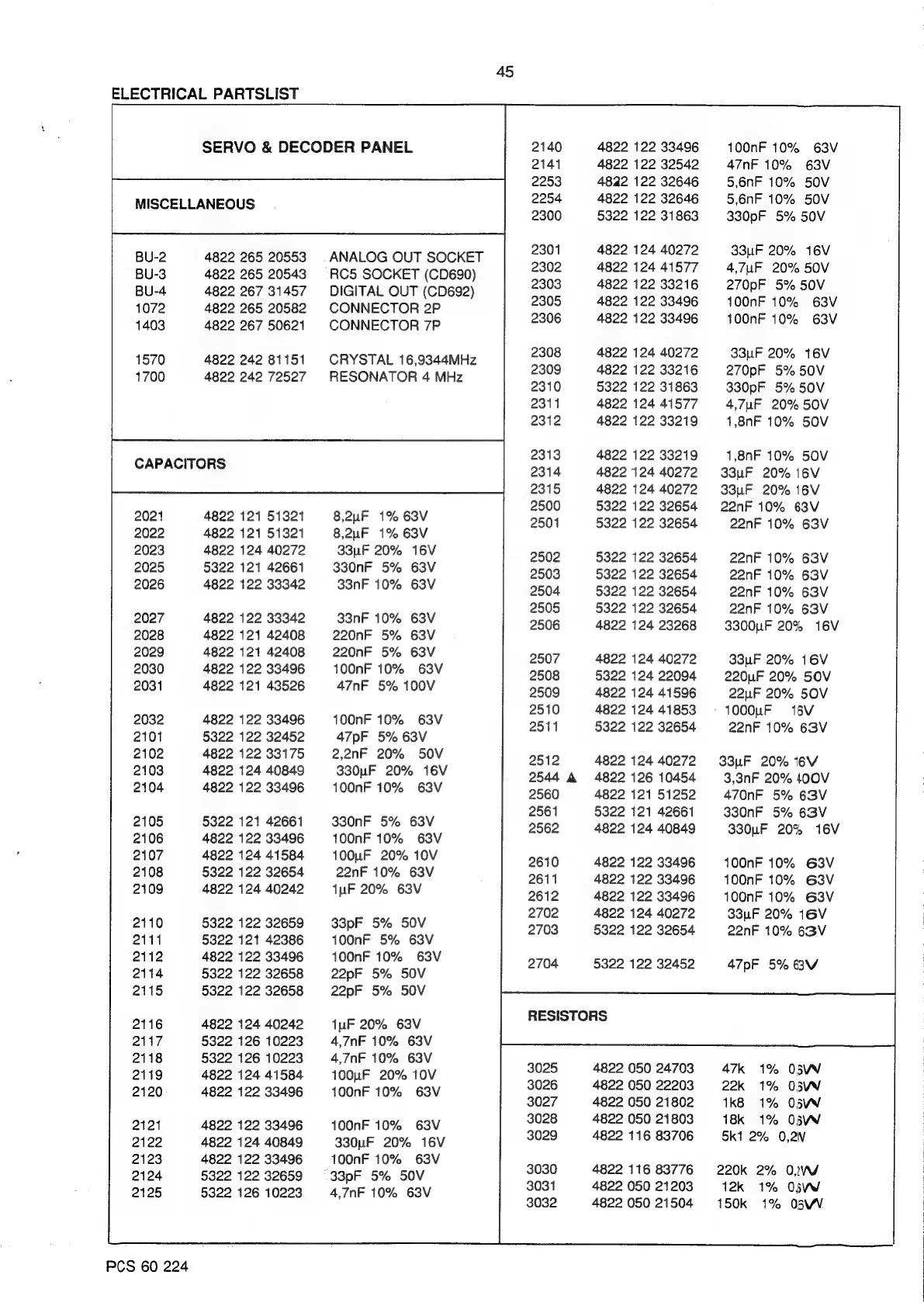 Philips CD690 - Electrical Partslist; Servo & Decoder, Miscellaneous Parts; Capacitors and Resistors