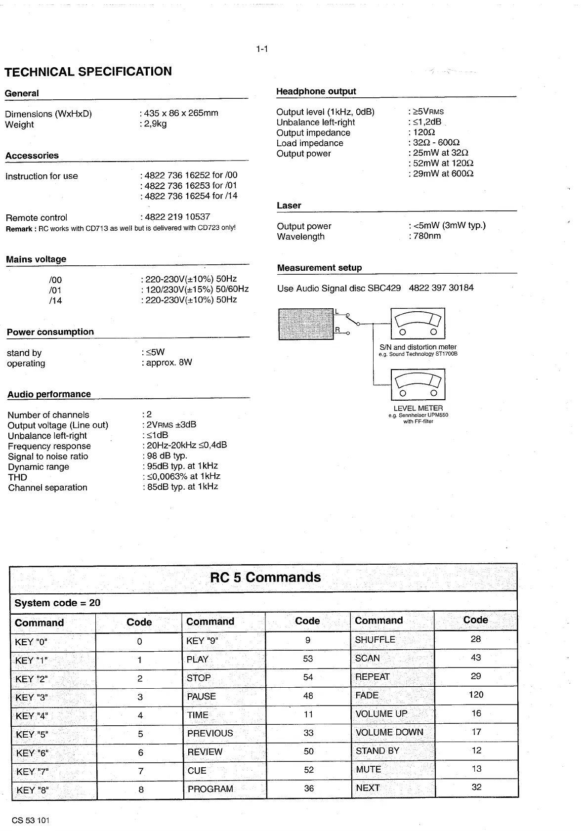 Philips CD713 - Standard Product Information; Audio Performance Specifications; Optical Read-out System; Audio Output Details