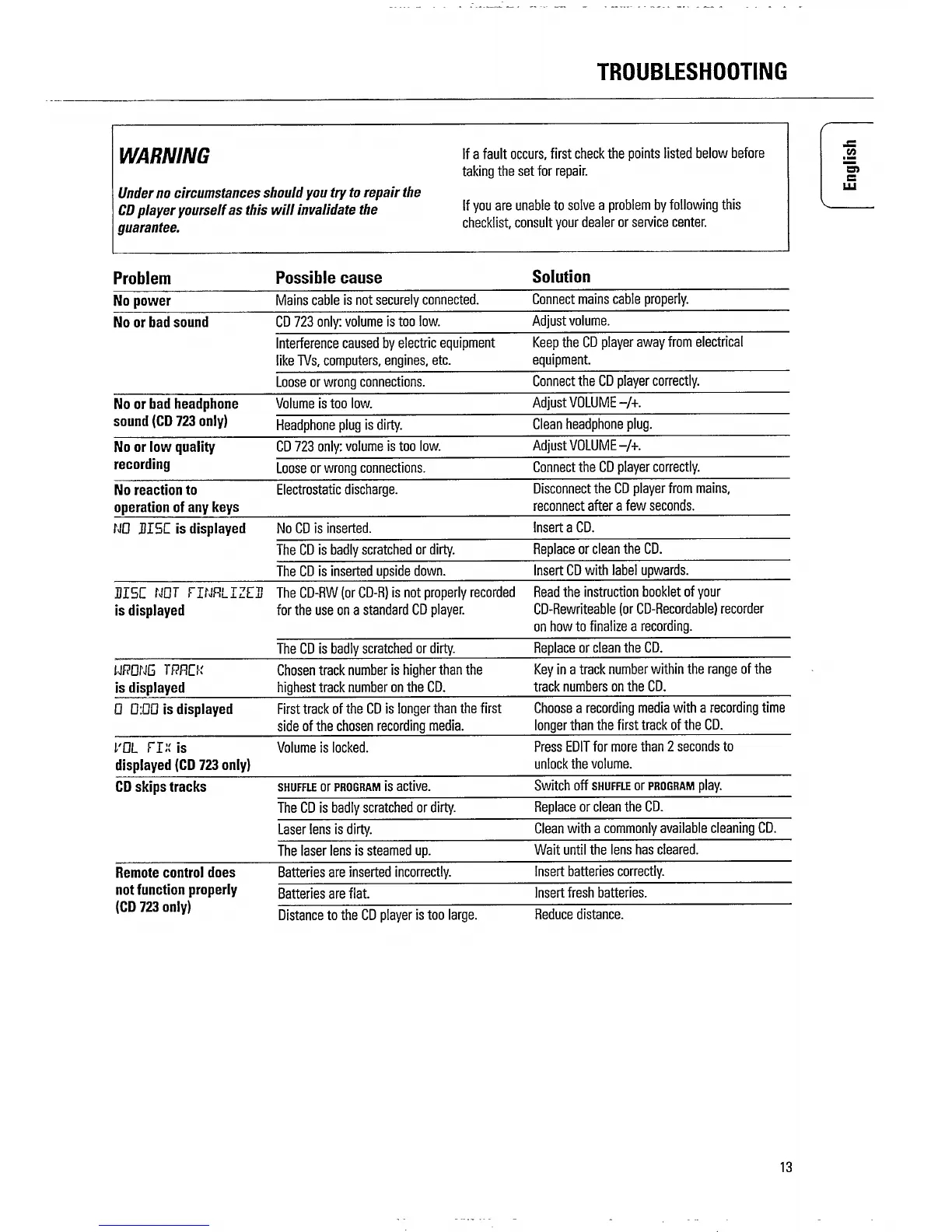 Philips CD723/20 - Troubleshooting; General Warning; Power and Sound Issues; Disc and Operation Issues