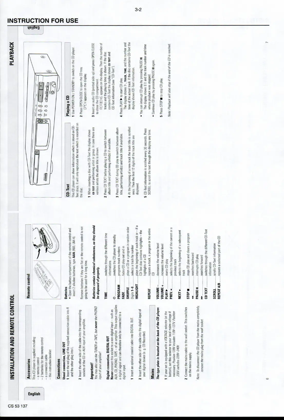 Philips cd753 - Installation and Remote Control; Playback; Connections; Mains