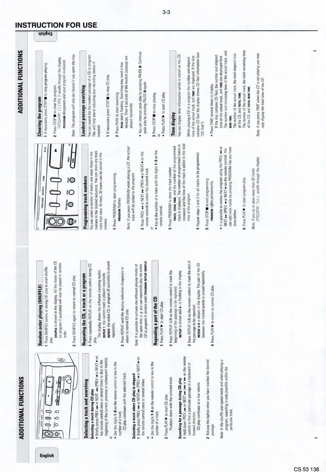 Philips cd753 - Additional Functions; Random Order Playing; Selecting a Track and Searching; Repeating a CD, a Track or a Program