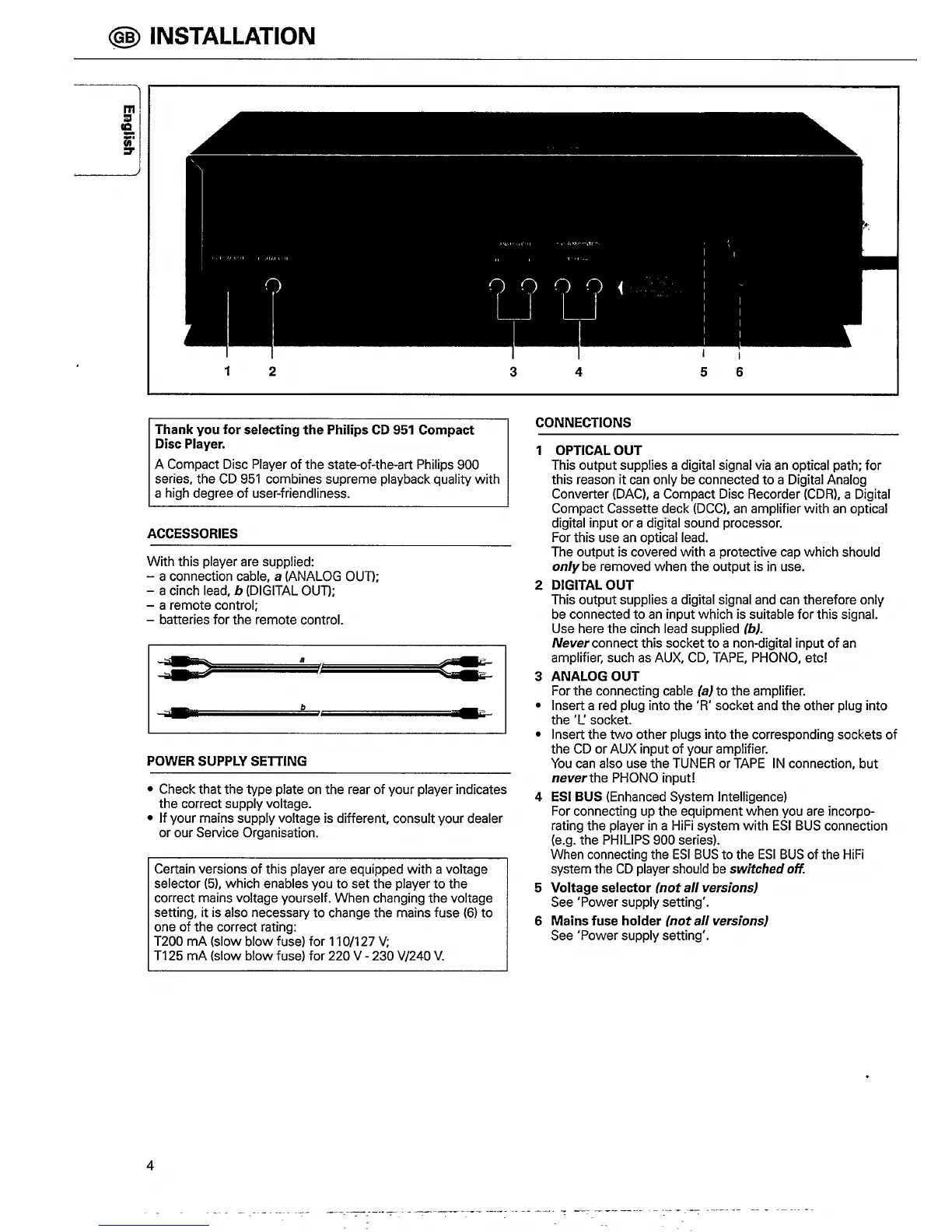 Philips CD951 - Installation and Connection; Power Supply Setting; Connections; Optical and Digital Audio Outputs