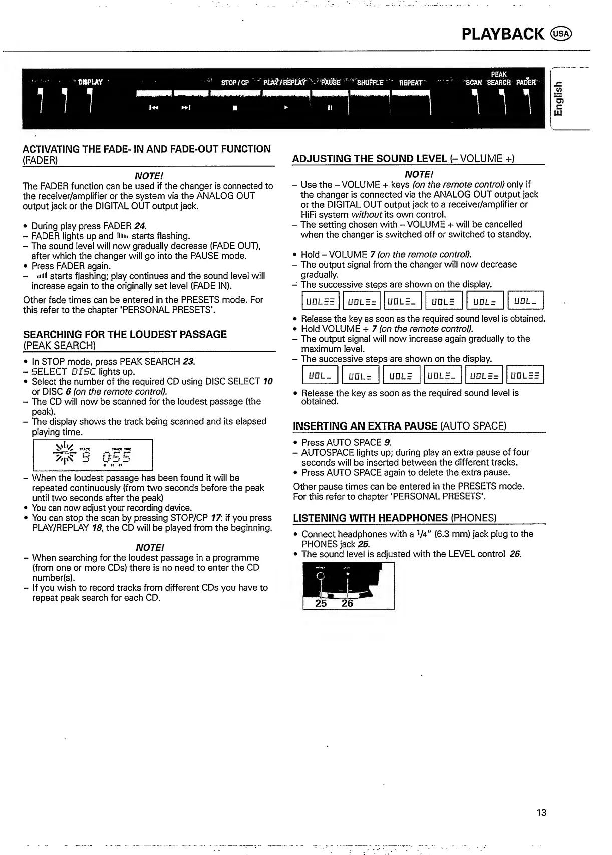 Philips CDC 936 - Activating the Fade-In and Fade-Out Function; Searching for the Loudest Passage; Adjusting the Sound Level; Inserting an Extra Pause