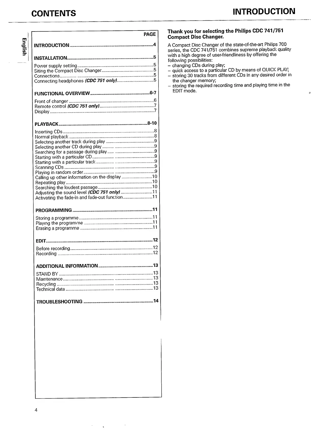 Philips CDC741 - CONTENTS; INTRODUCTION