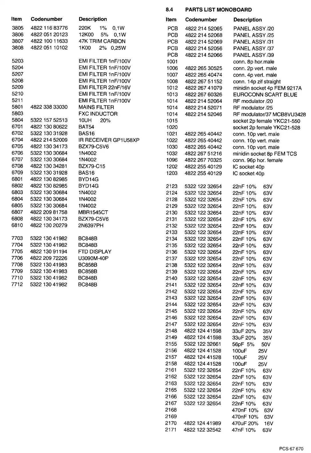 PARTS LIST MONOBOARD