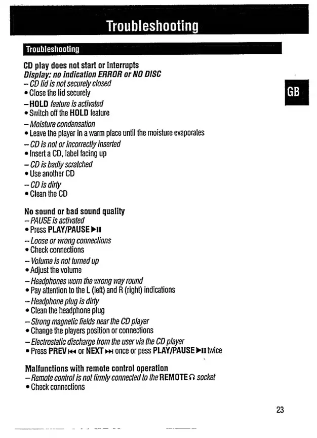 Philips CDP 200 - Troubleshooting (Continued); CD Playback Errors; Sound Quality Issues; Remote Control Malfunctions