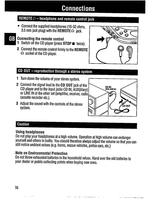 Philips CDP 200 - Connections; Connecting Headphones and Remote; Connecting to a Stereo System; Headphone Usage Safety
