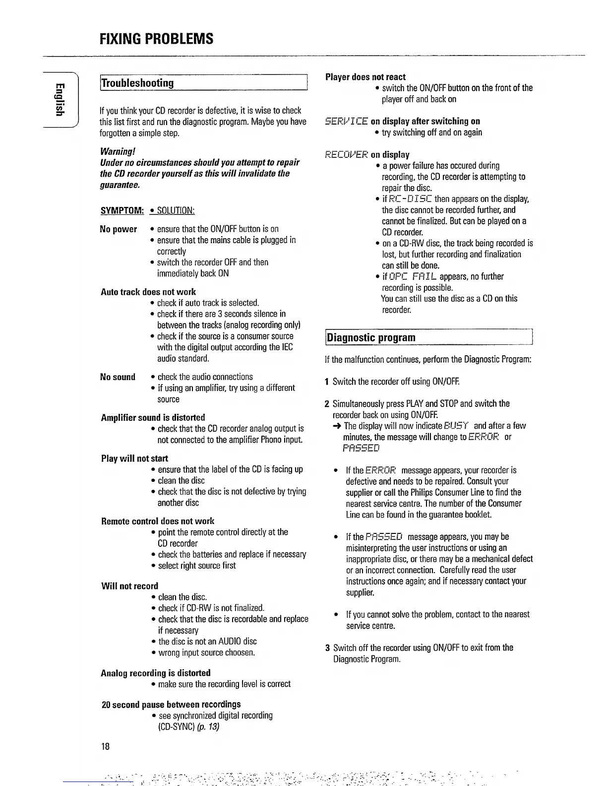 Philips CDR 560 - Fixing Problems; Troubleshooting; No Power; Player Does Not React