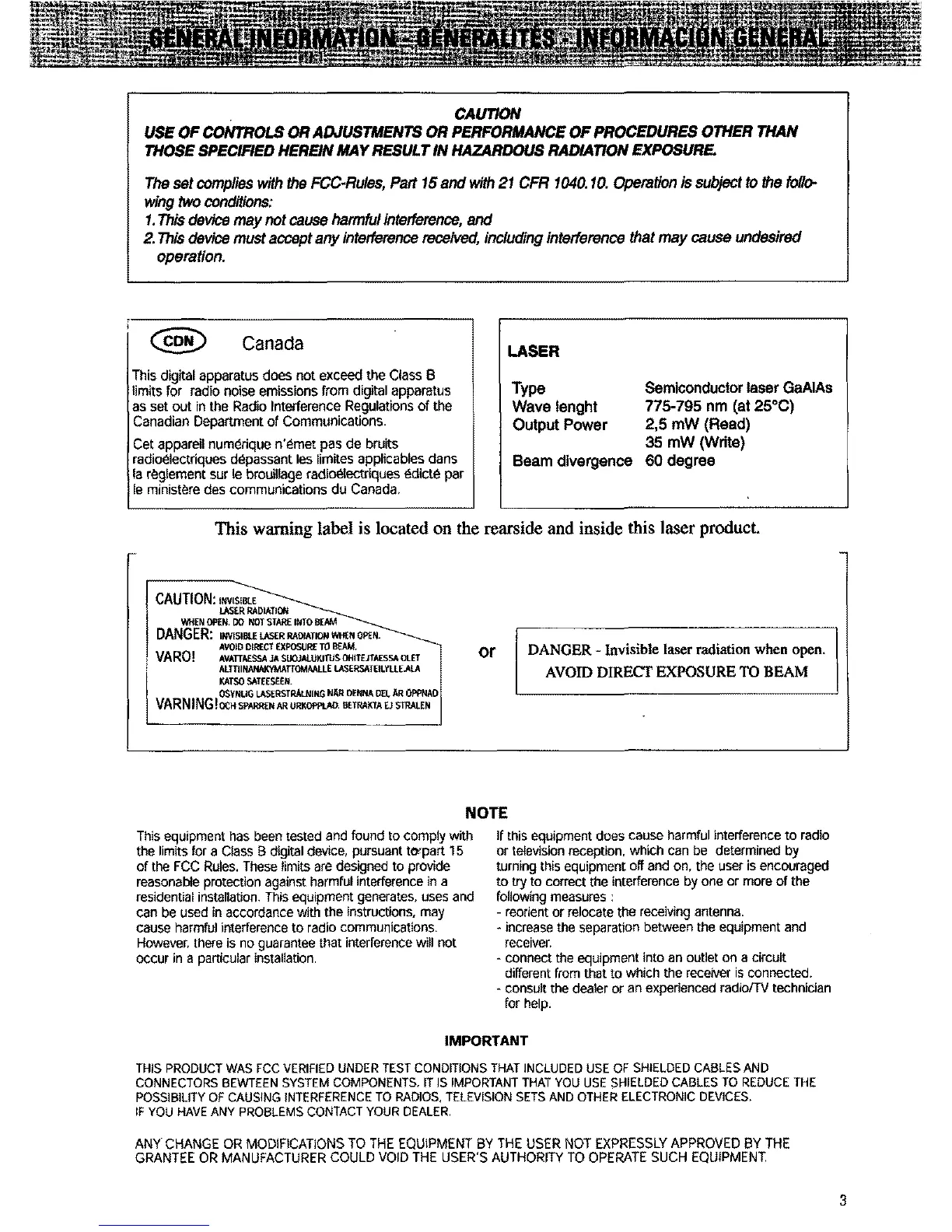 This warning label is located on the rearside and inside this laser product.