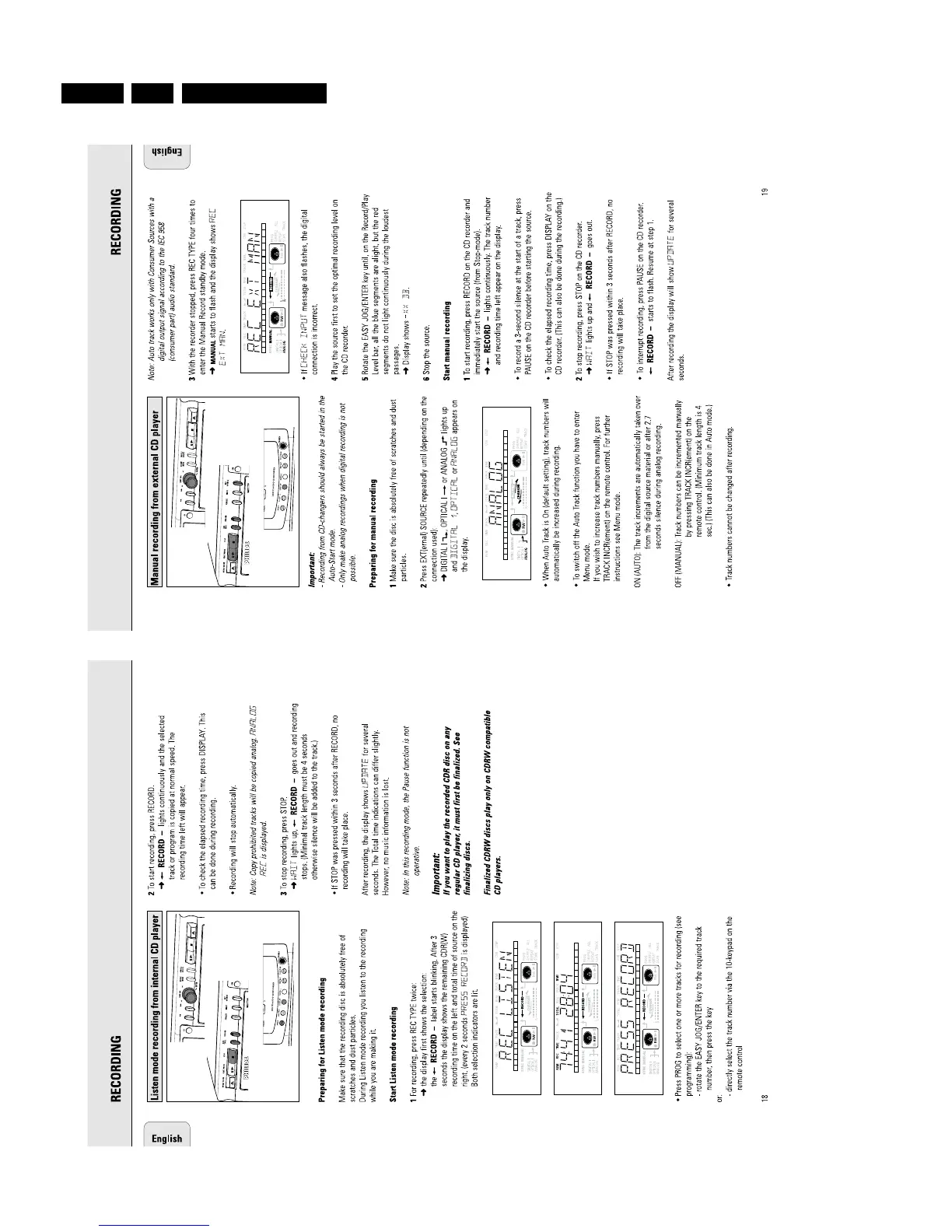 Philips CDR775 - Listen Mode Recording from Internal CD Player; Manual Recording from External CD Player; Preparing for Manual Recording