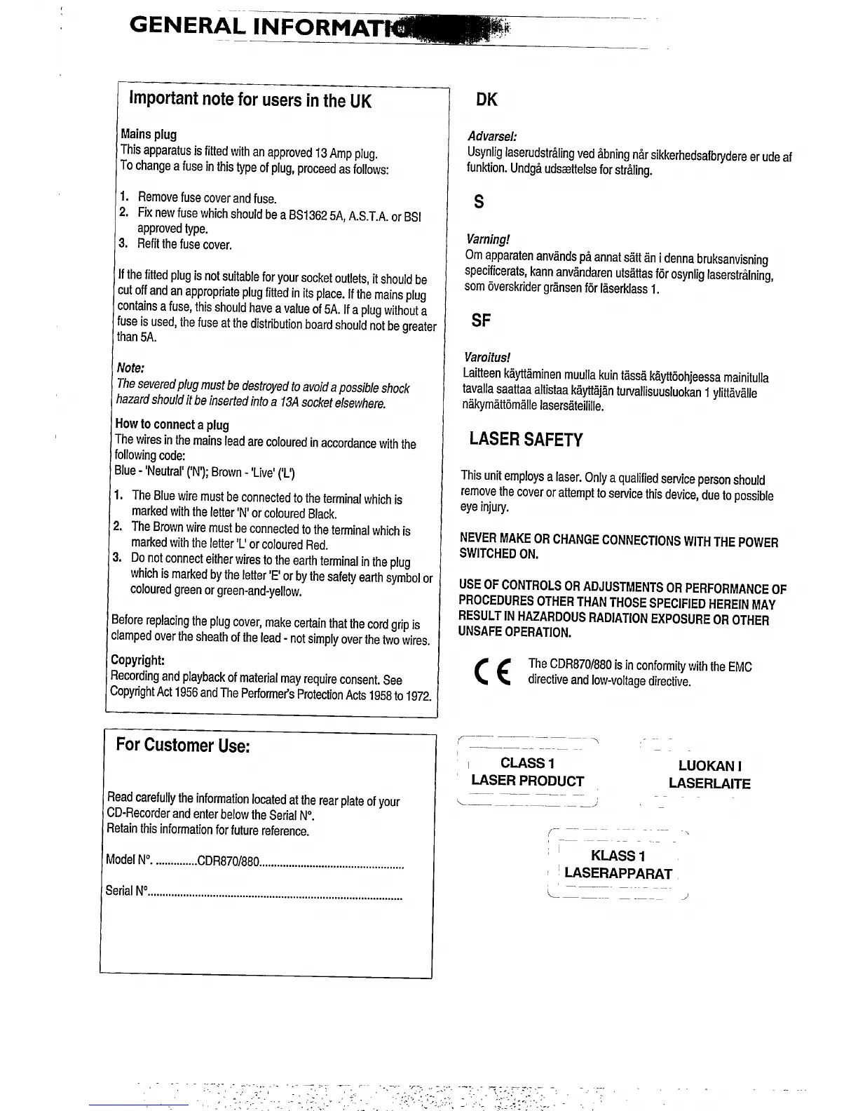 Philips CDR870/17 - General Information and Safety; UK Mains Plug and Wiring; Laser Safety Precautions