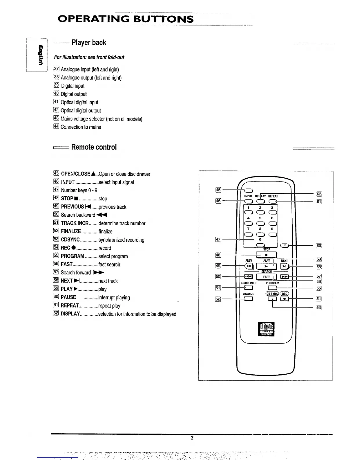 Philips CDR870/17 - Remote Control and Rear Panel Operations; Rear Panel Connections; Remote Control Functions