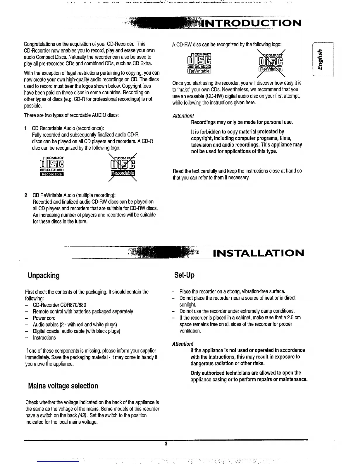 Philips CDR870 - INSTALLATION; Unpacking, Voltage, and Placement