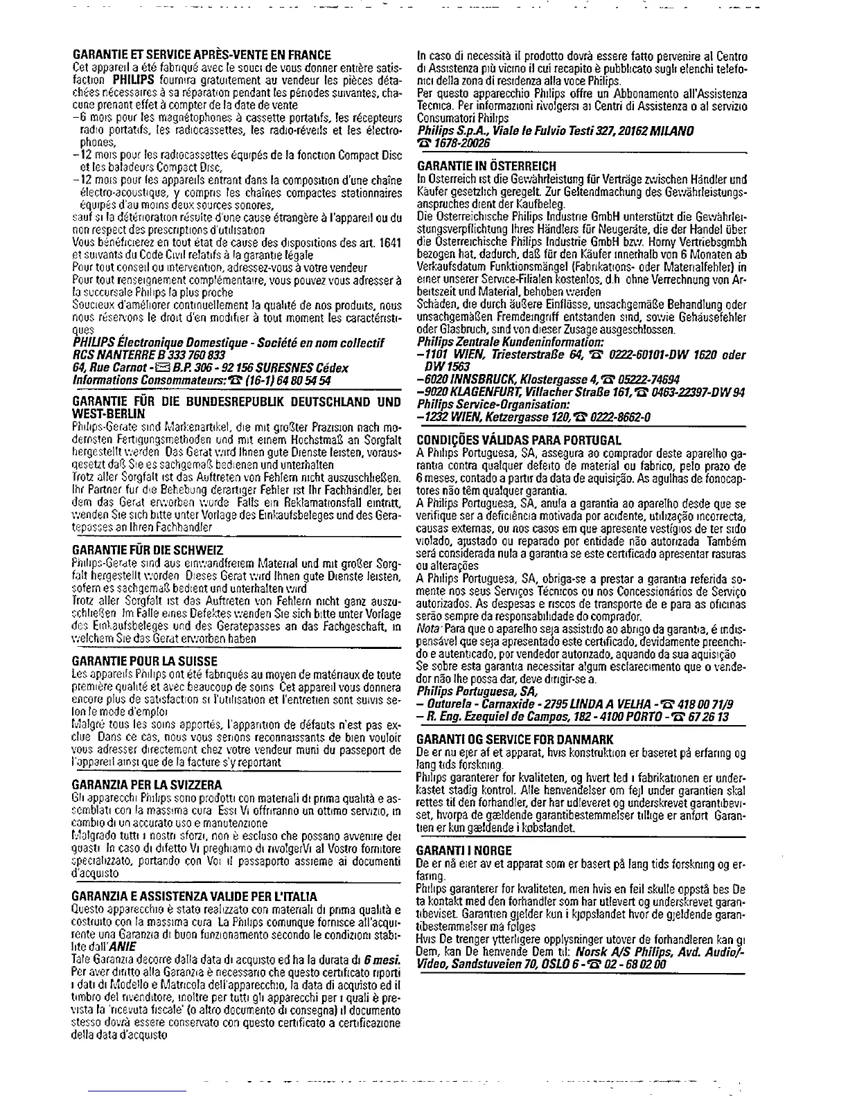 Philips Clock Radio - France Guarantee and Service; Austria Guarantee and Service; Portugal Guarantee and Service; Denmark Guarantee and Service