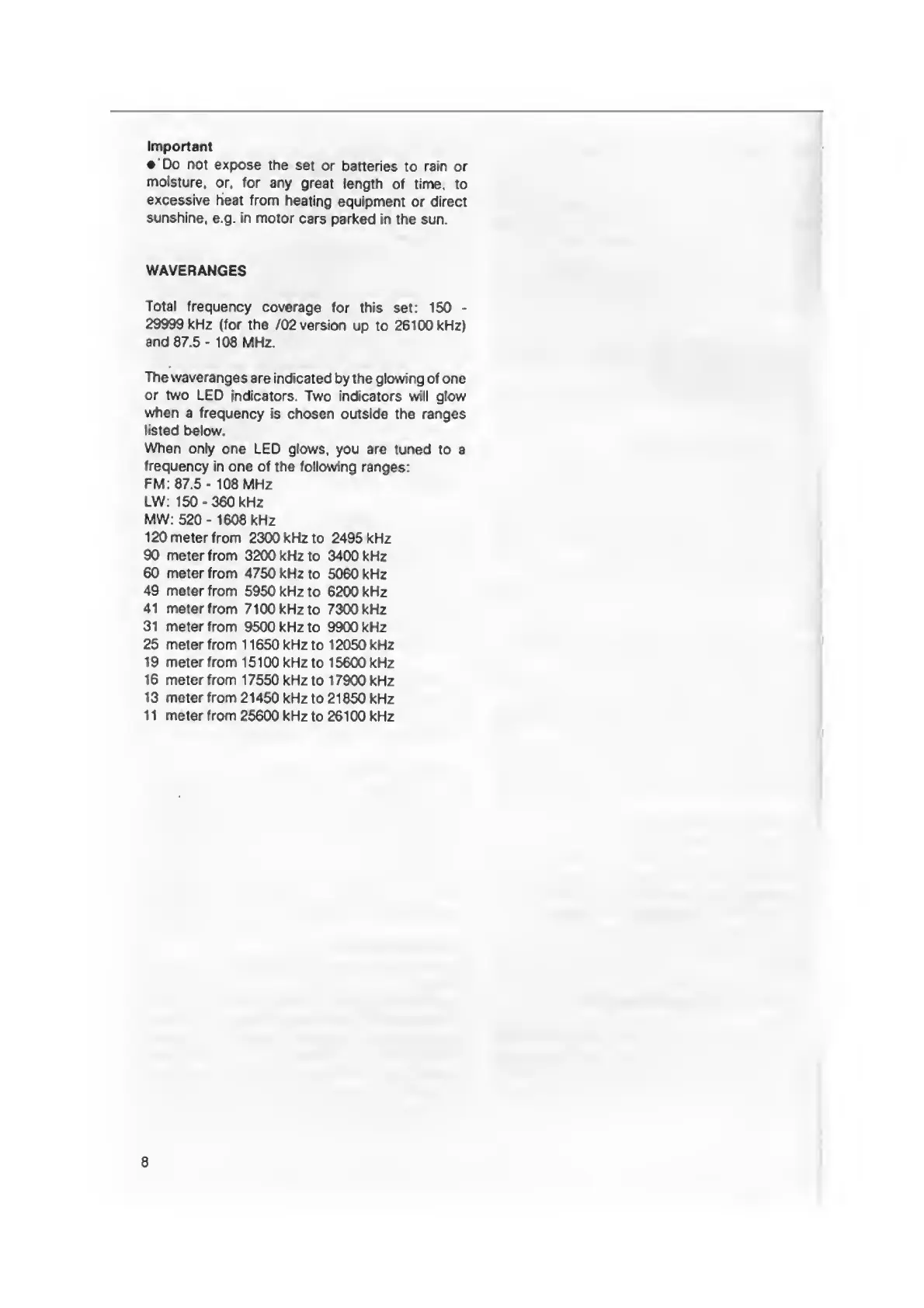 Philips D 2999 - FREQUENCY RANGES AND WAVELENGTHS; Frequency Coverage and Band Indicators; Detailed Waverange Band List; Environmental Safety Precautions