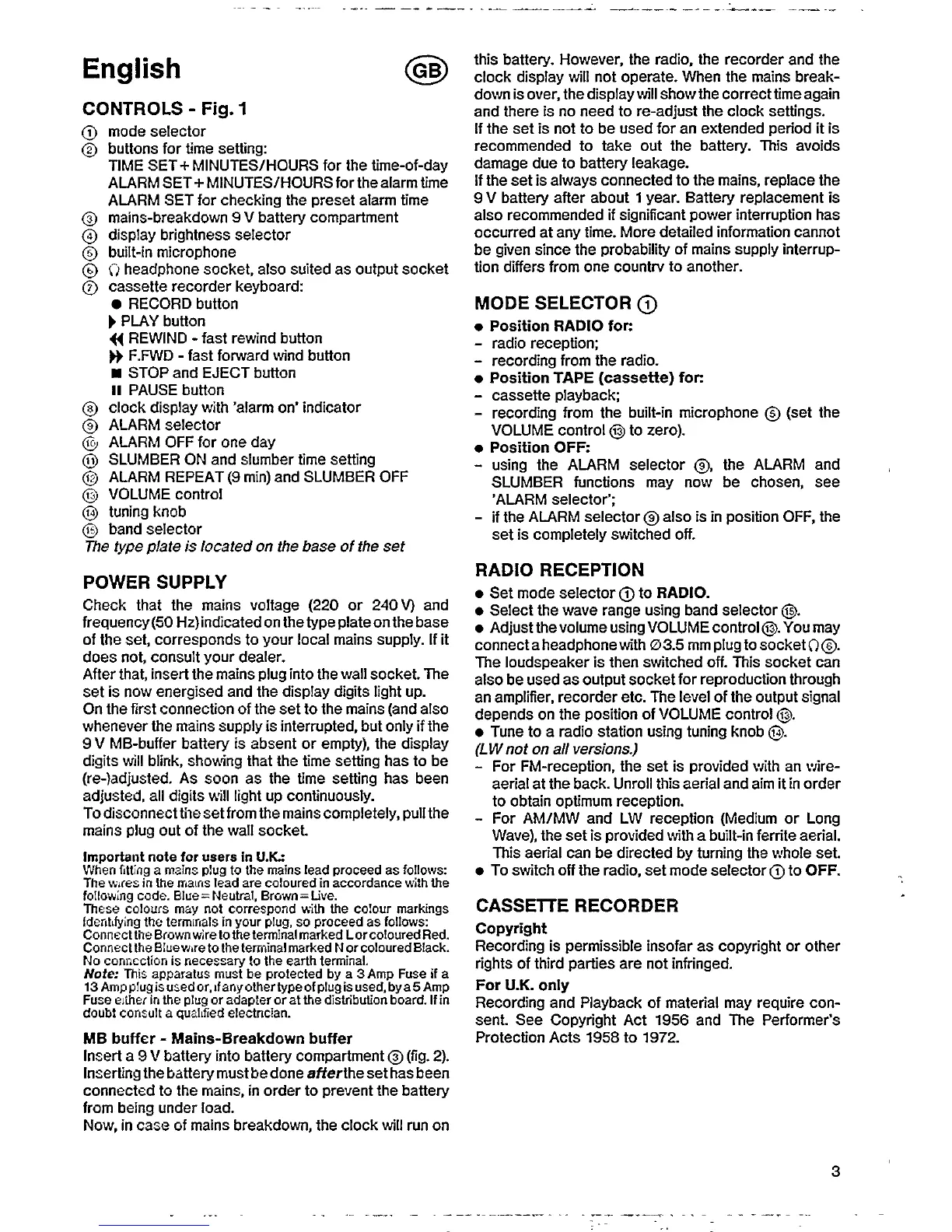 Philips D 3700 - Controls; Power Supply; Mode Selector; Radio Reception