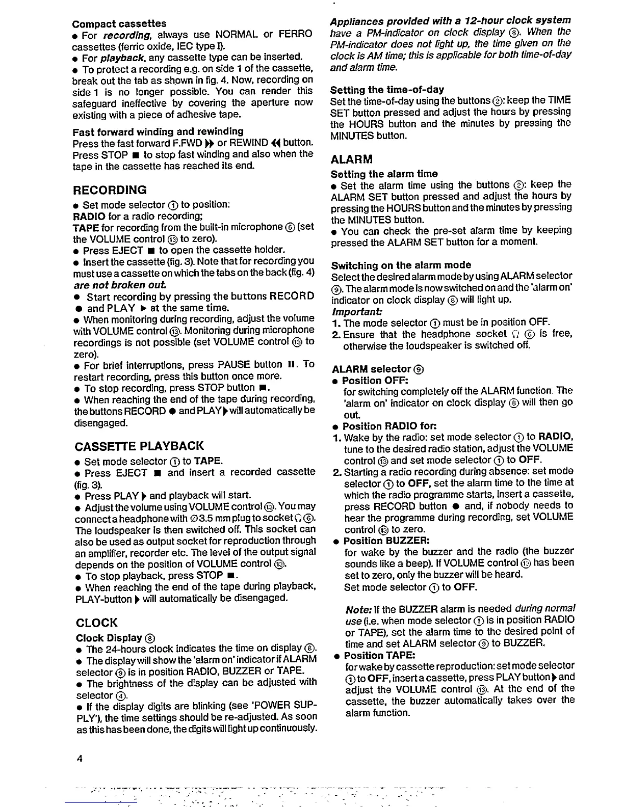 Philips D 3700 - Recording; Cassette Playback; Clock; Alarm