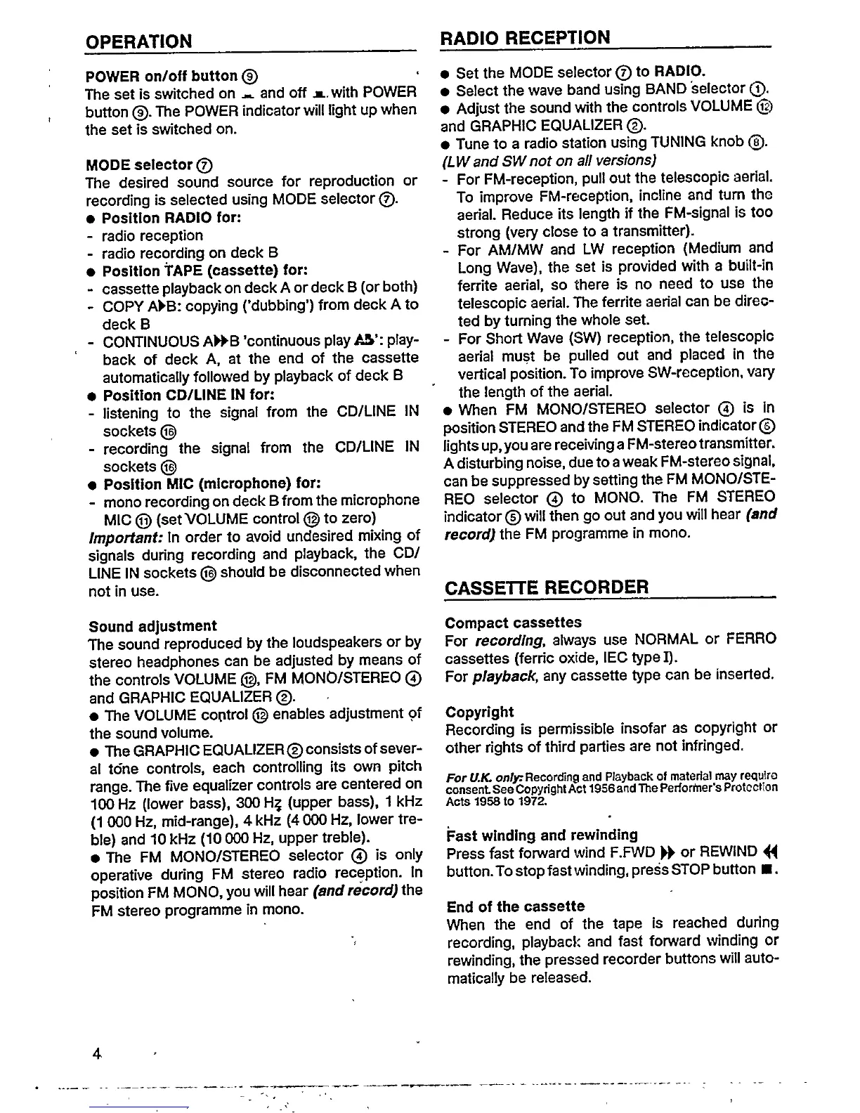 Philips D 8479 - OPERATION; RADIO RECEPTION; CASSETTE RECORDER