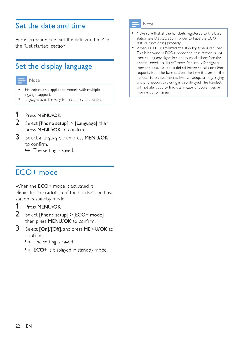 Philips D250 - Set the Date and Time; Set the Display Language; ECO+ Mode