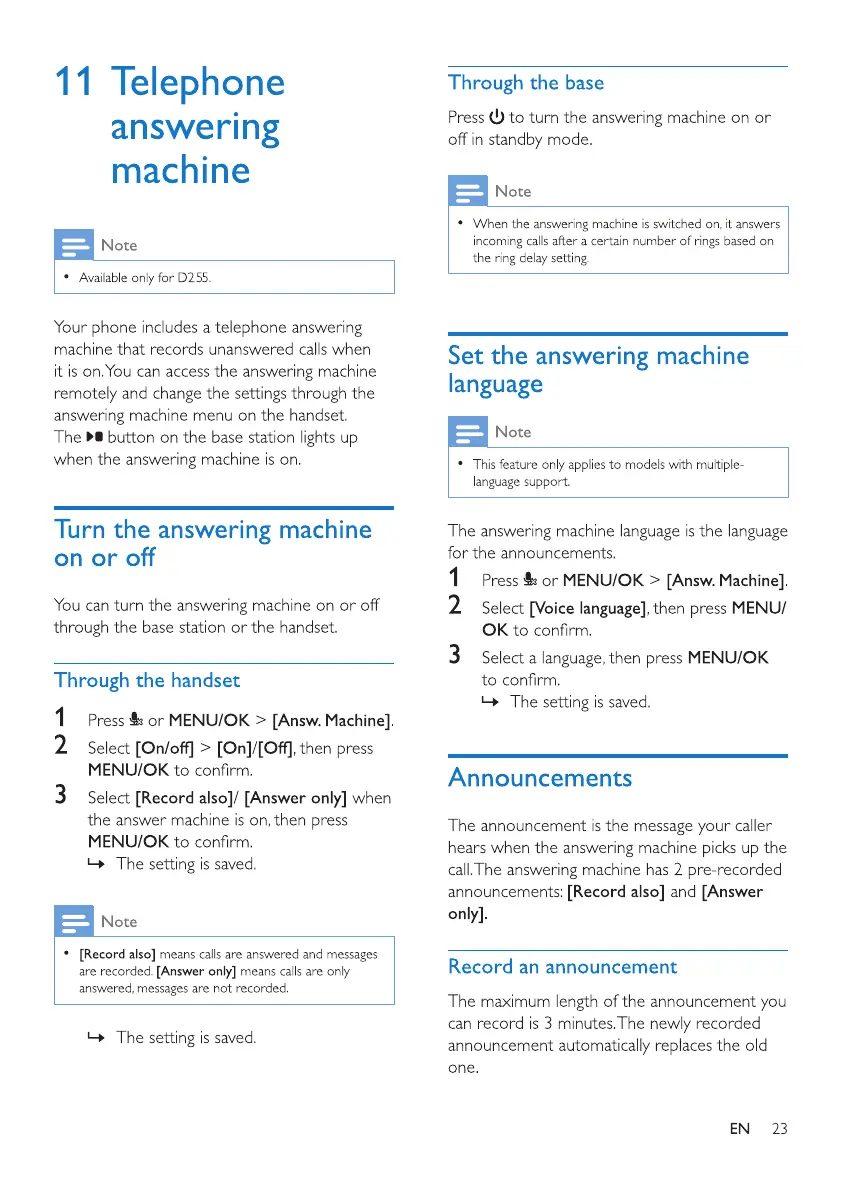 Philips D250 - 11 Telephone Answering Machine; Turn the Answering Machine on or off; Set the Answering Machine Language