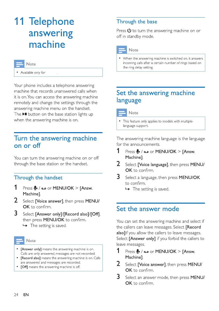 Philips D260 - Telephone Answering Machine; Turn the Answering Machine on or off; Set the Answering Machine Language; Set the Answer Mode
