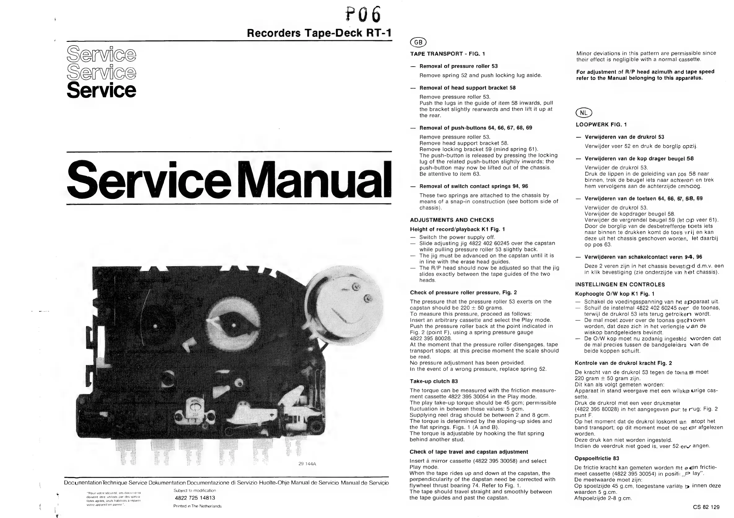 Philips D8334 - TAPE TRANSPORT OPERATION; Tape Transport Component Removal; ADJUSTMENT AND CHECK PROCEDURES; Head Height and Pressure Roller Adjustment