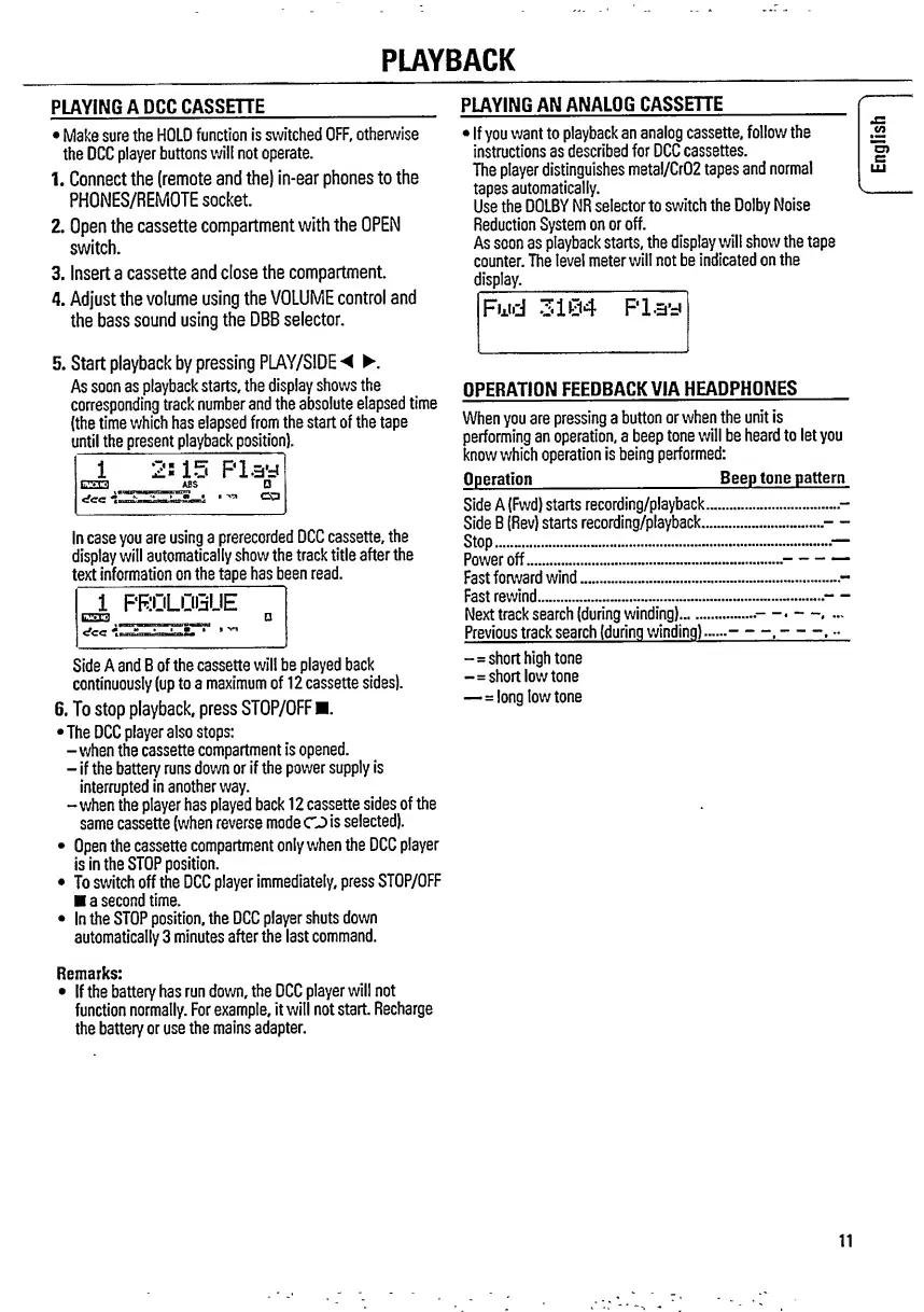 Philips DCC 170 - PLAYBACK; Playing a DCC Cassette; Playing an Analog Cassette; Operation Feedback